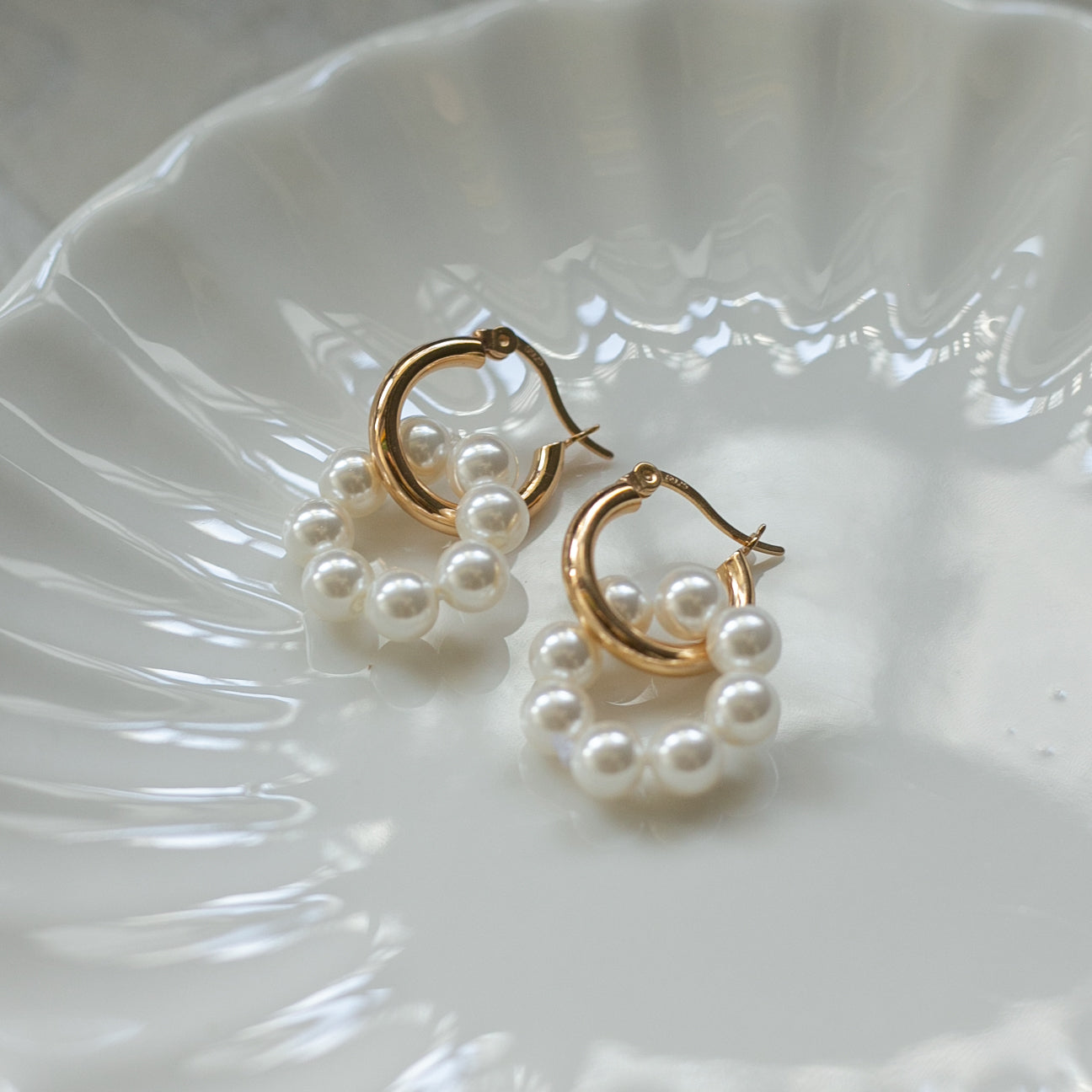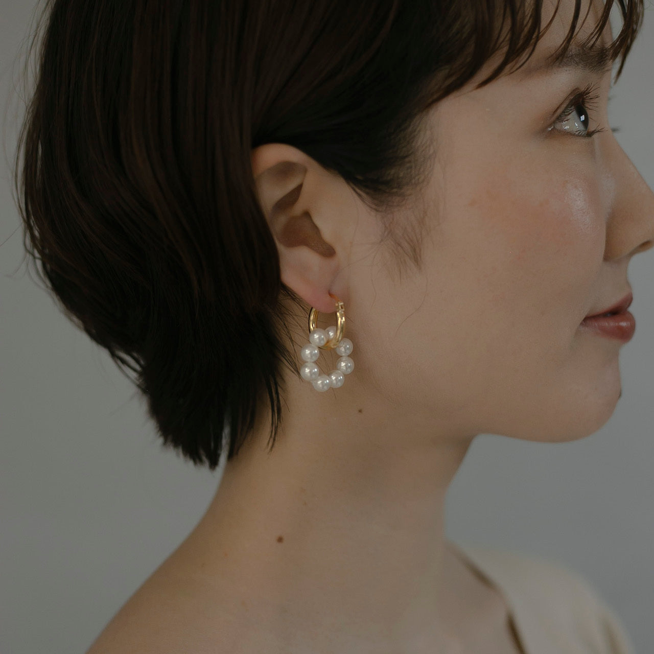 トレンドのパールのリングとゴールドの組み合わせがとても可愛らしく、顔周りをすっきり華やかに見せてくれるピアスです!