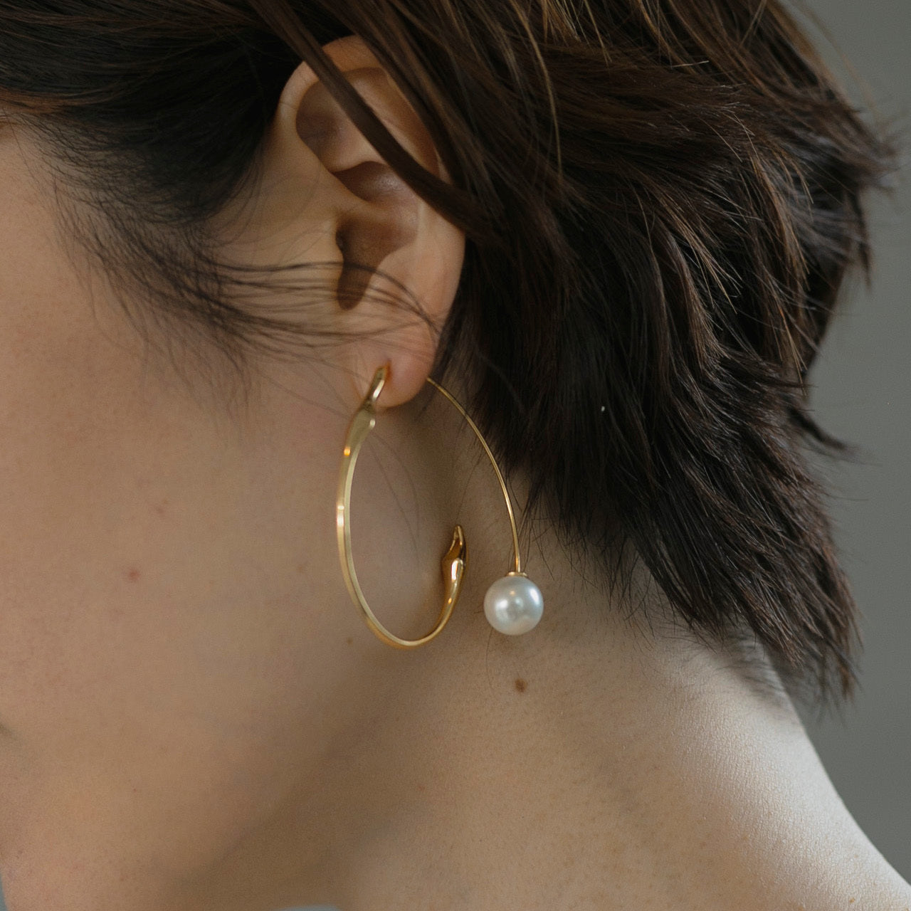 存在感のある大きめのフープにキャッチ部分がパールになったデザインがとても可愛く人気のピアスです!