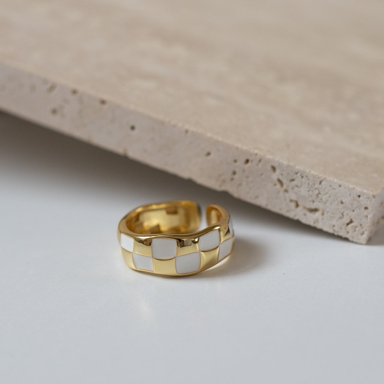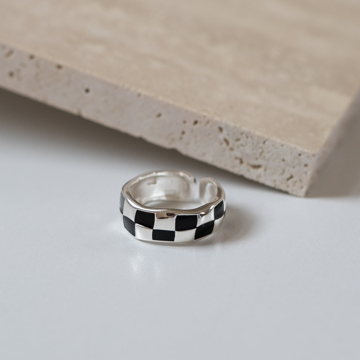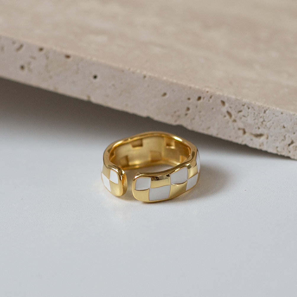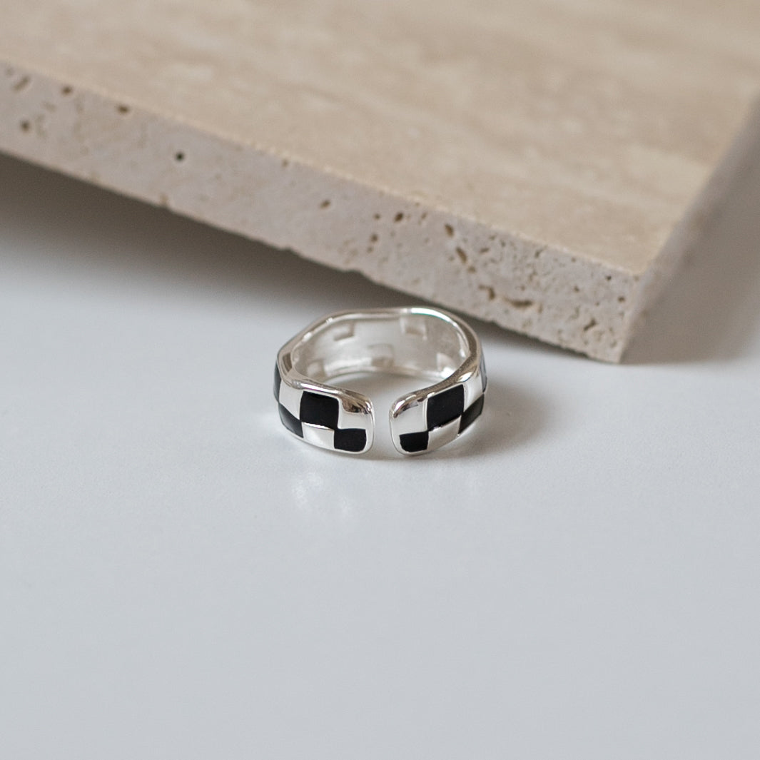 トレンドのチェッカー柄で、指に馴染む緩やかな曲線のフォルムとカラーリングがとても可愛いリングになります!
