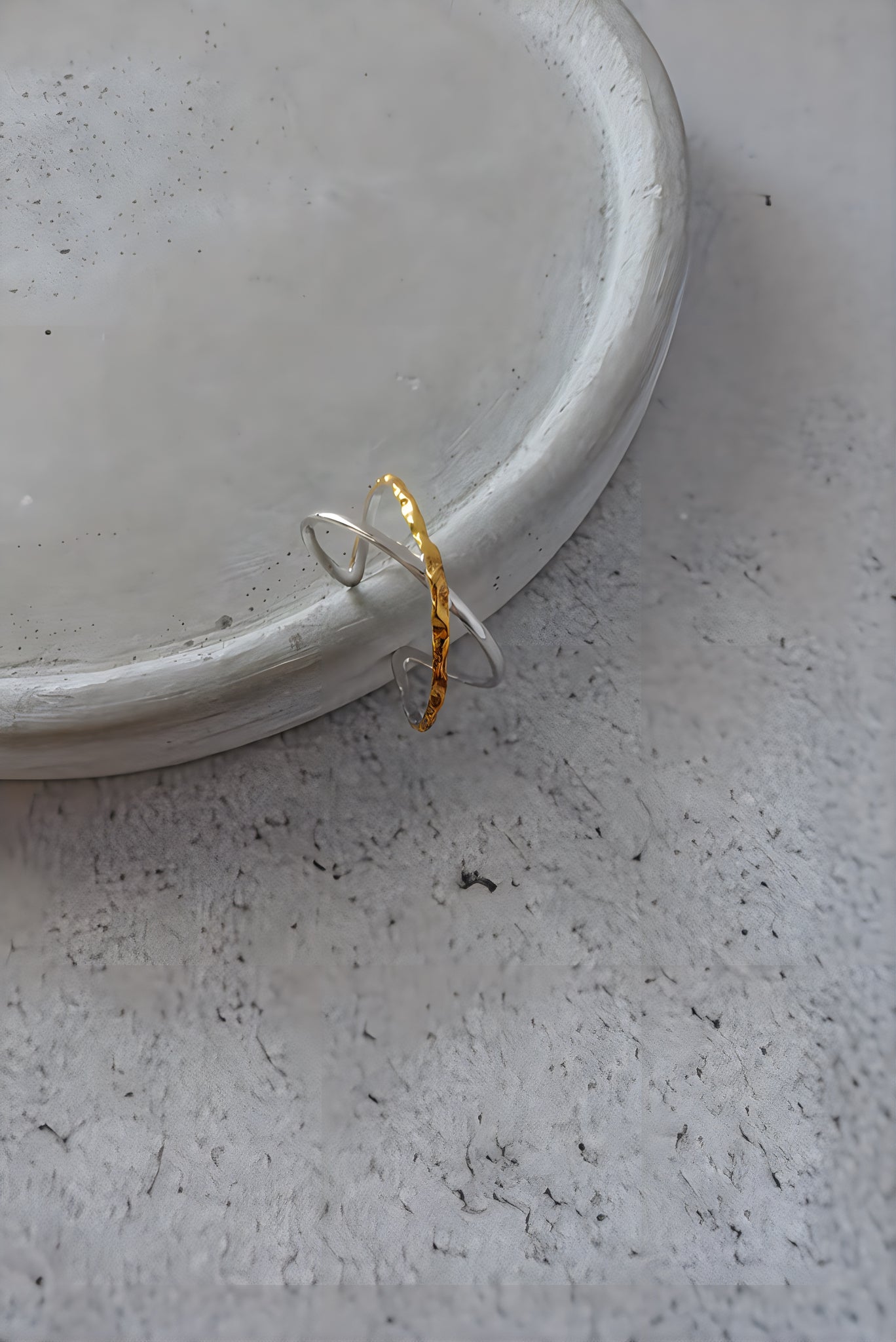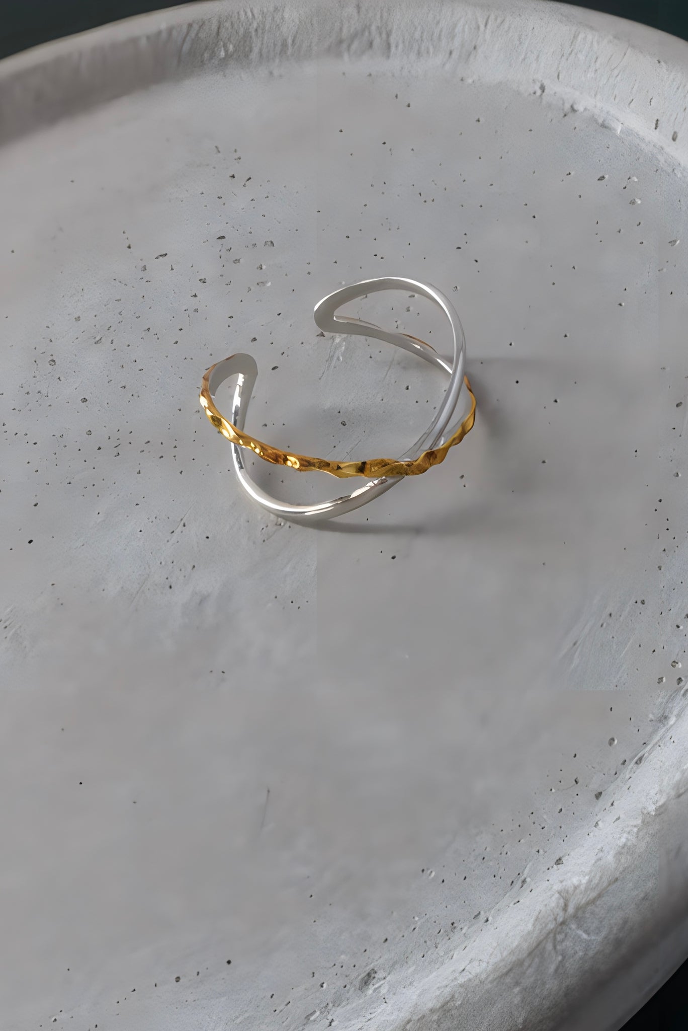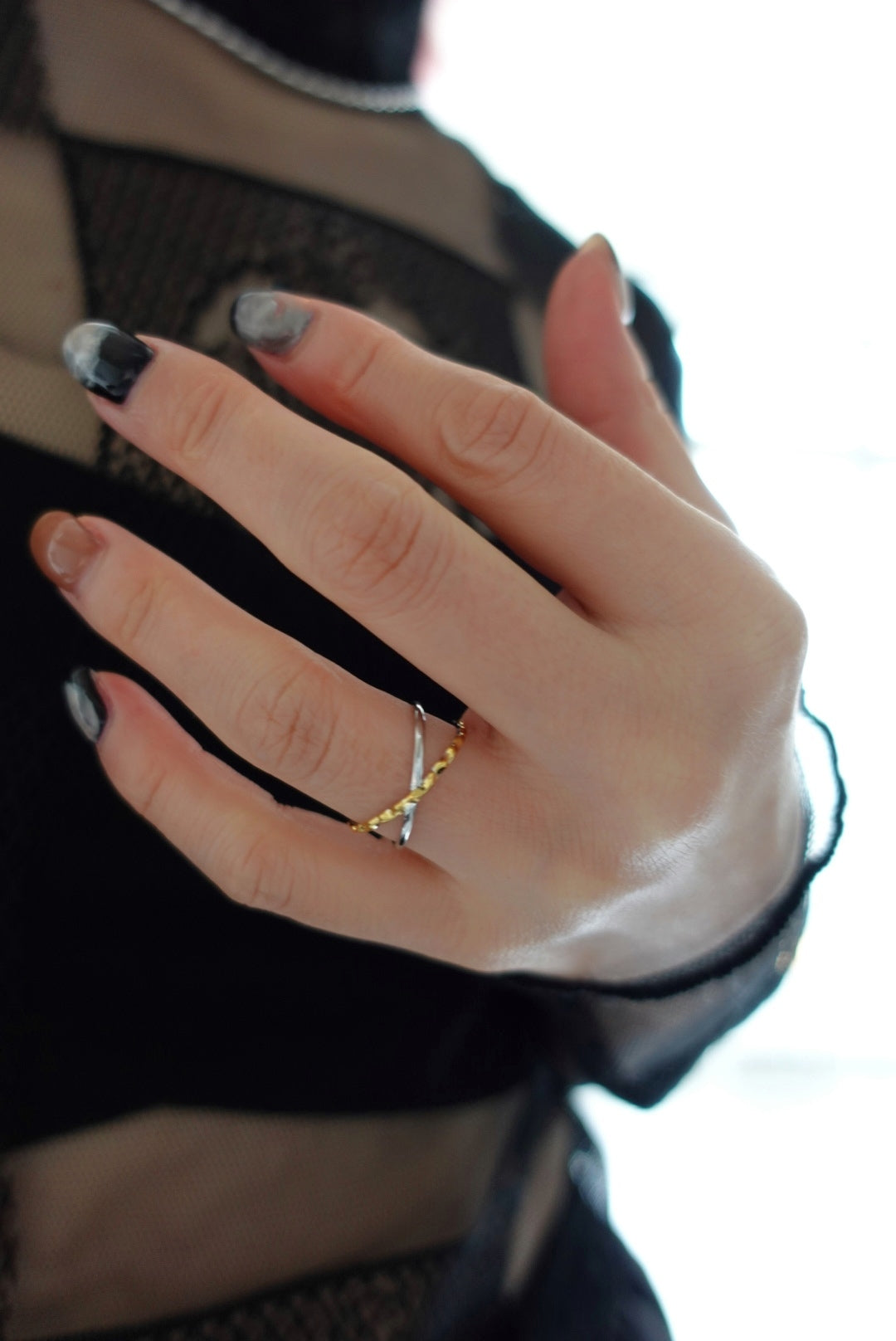 トレンドのバイカラーを細めのクロスデザインに落とし込んだ繊細な作りがとても可愛いリングです!