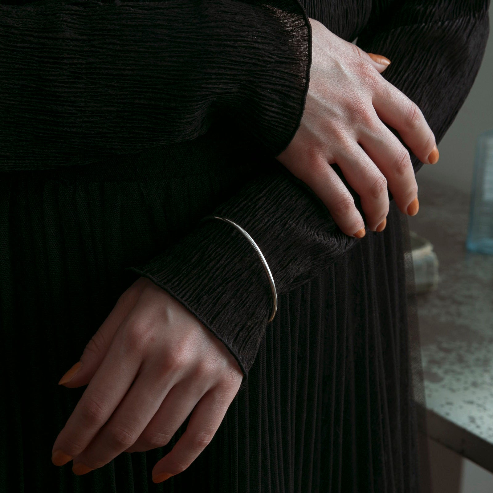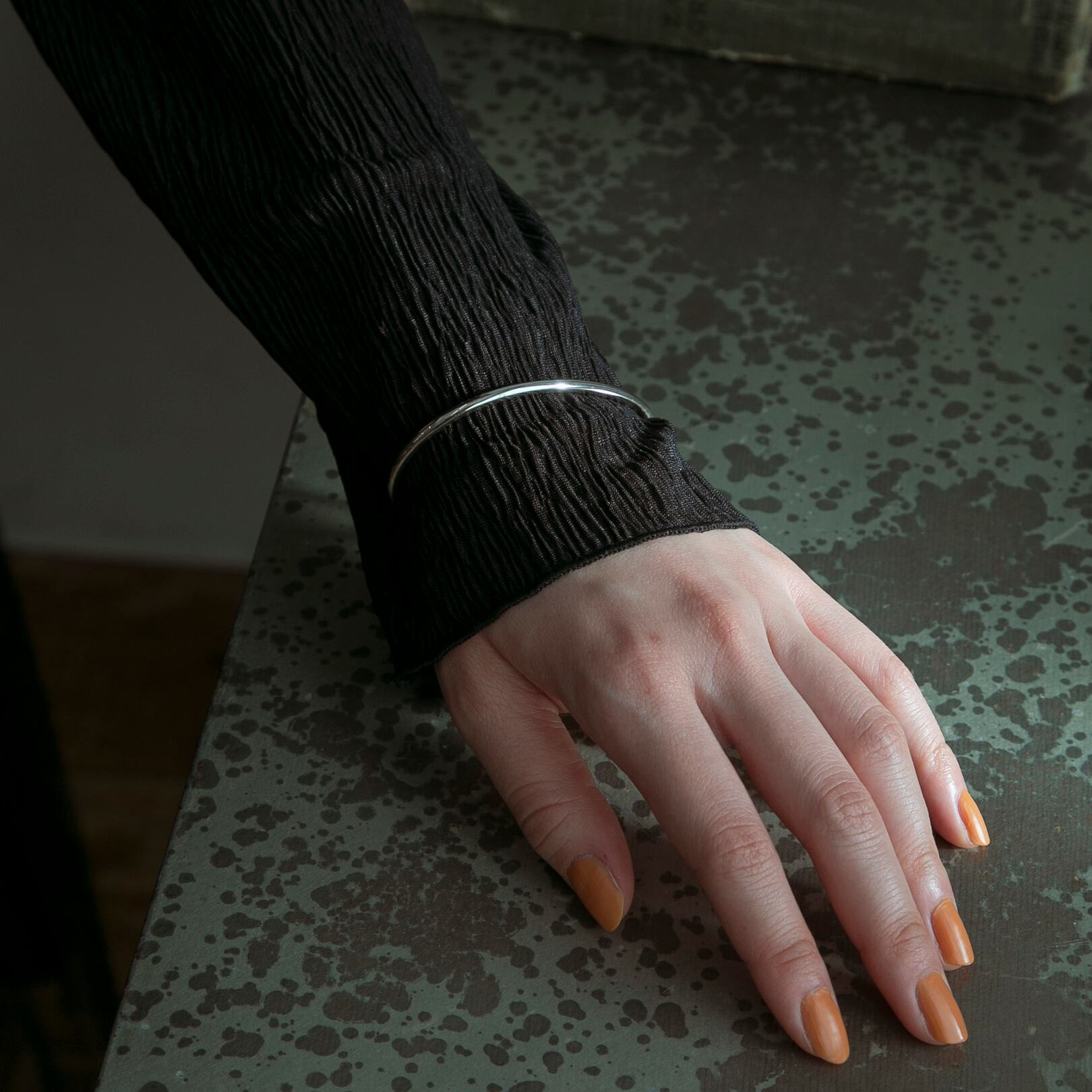 しっかりとした作りでシルバーの重みを感じていただけ、他のバングルやブレスレットを重ね付けしても可愛いです◎