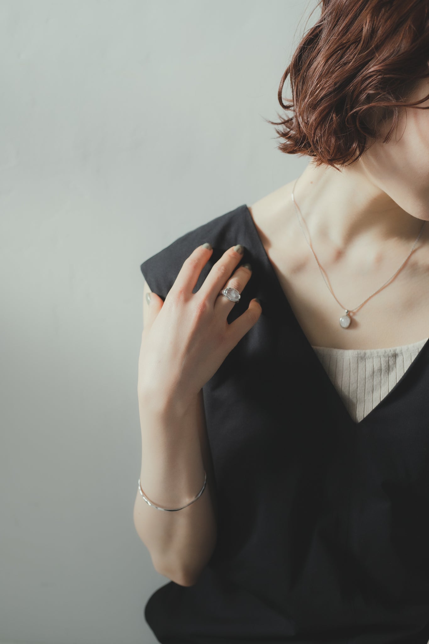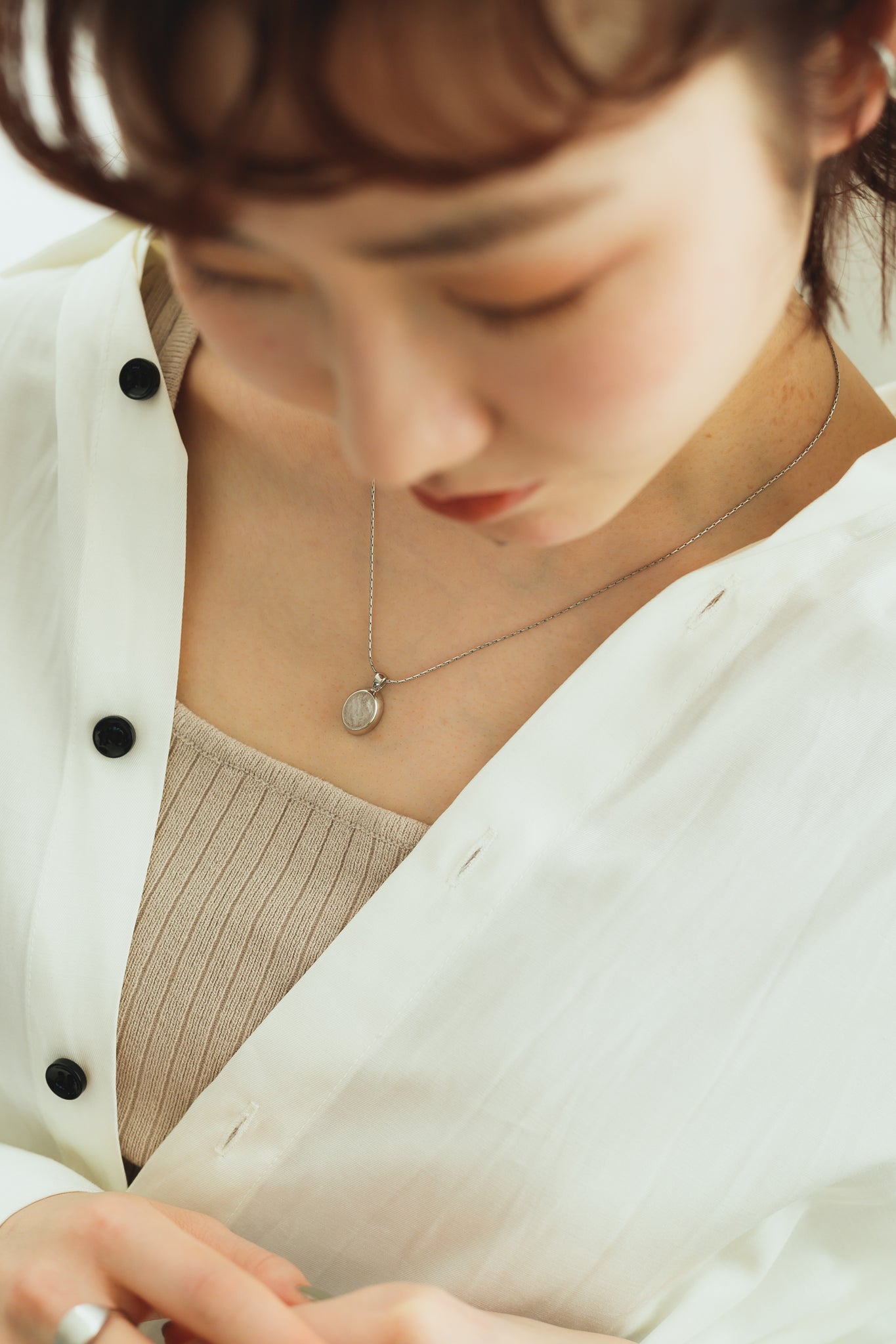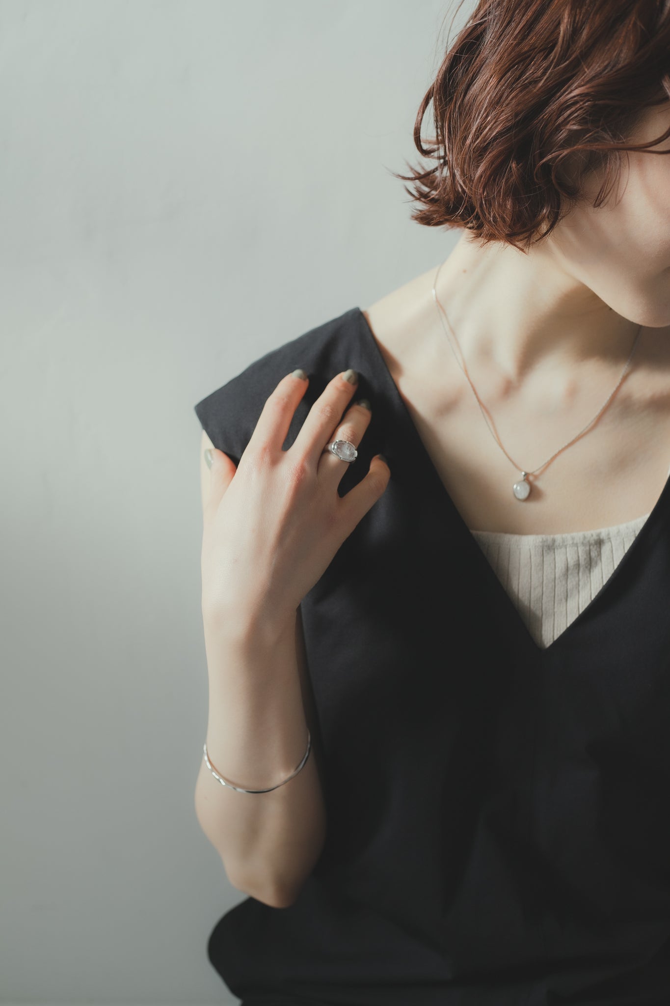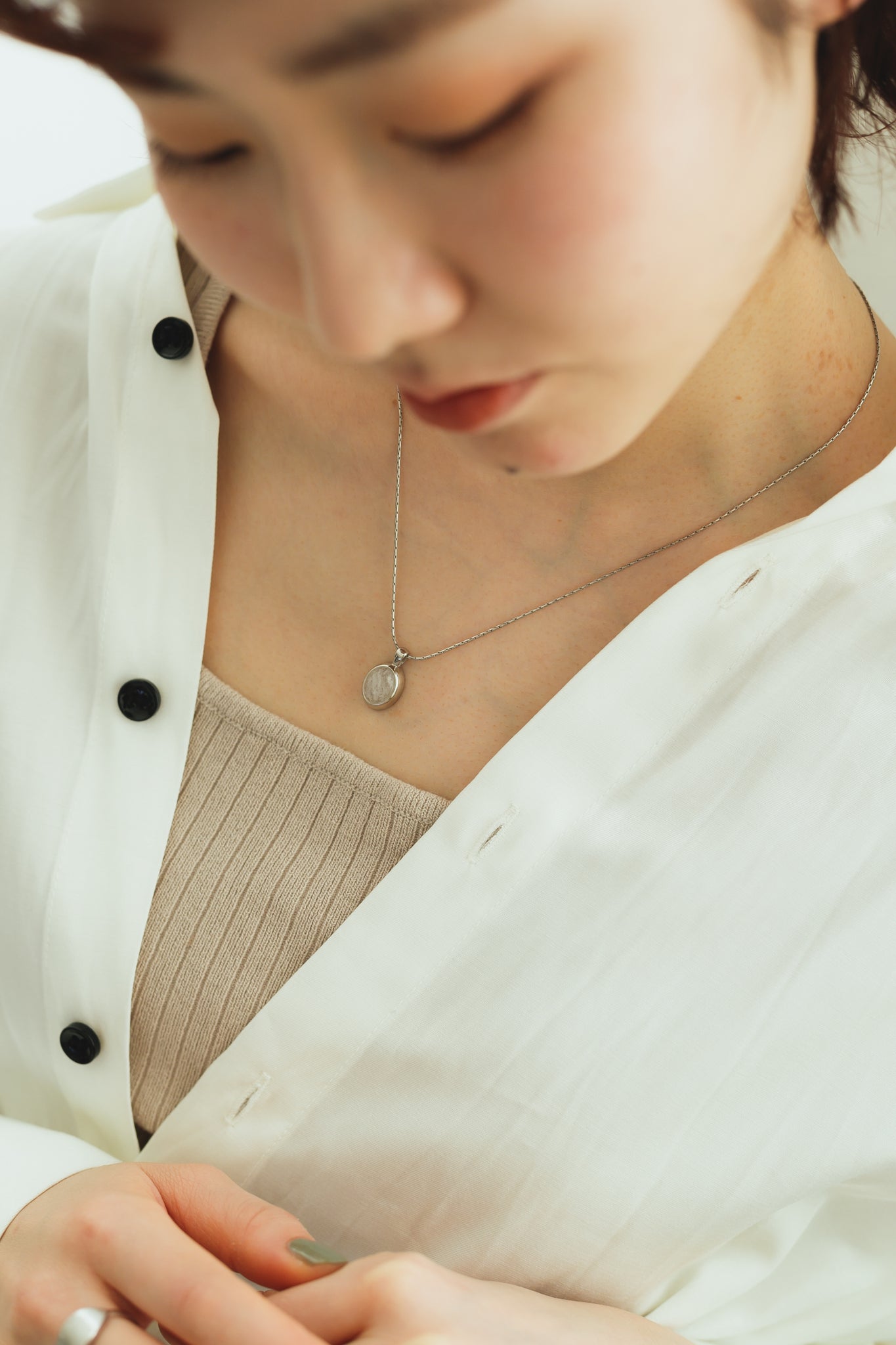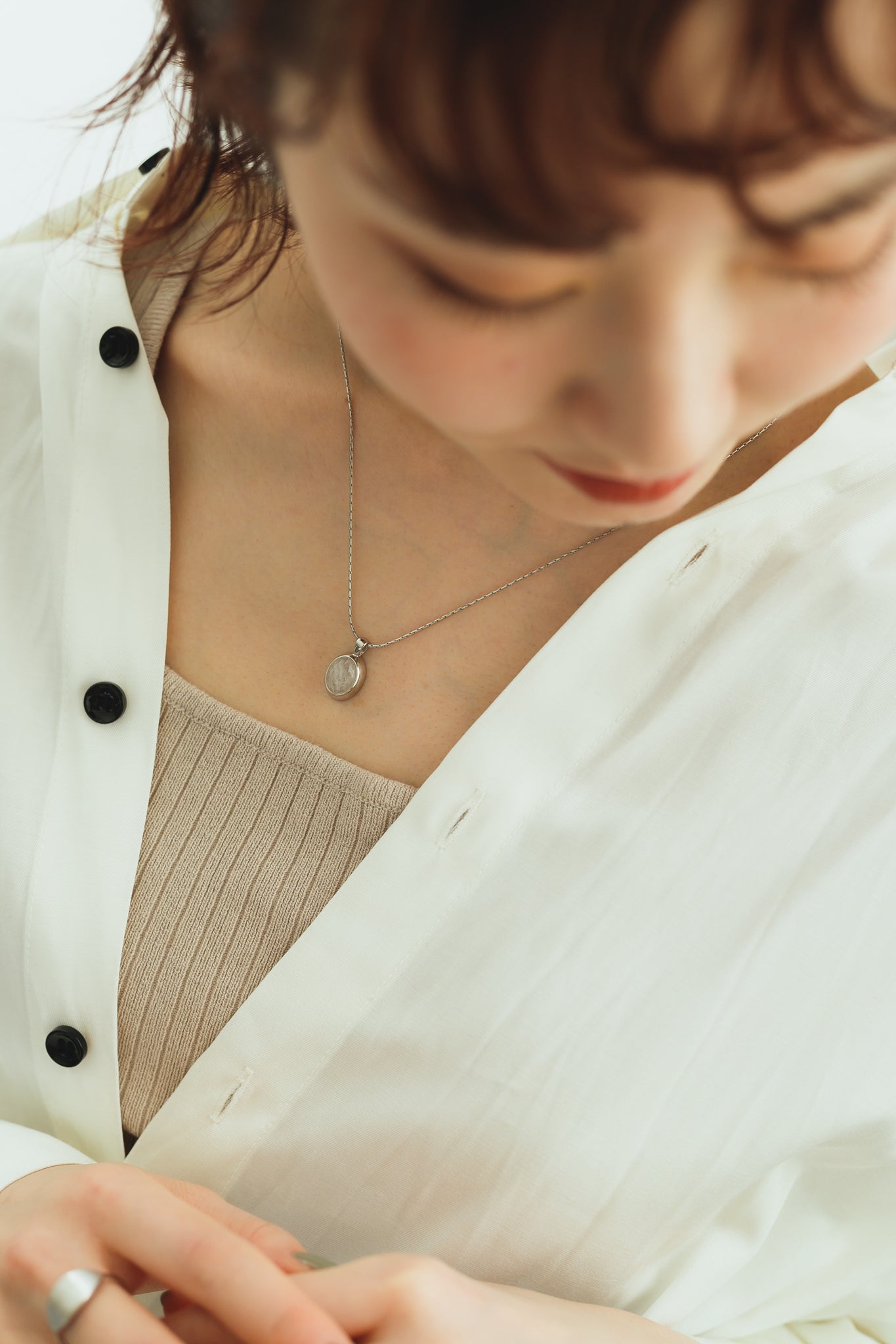 同じくホワイトクォーツを用いたリングと合わせてもお洒落で、首元を明るく綺麗に見せてくれ、大人カジュアルな雰囲気にもぴったりです◎