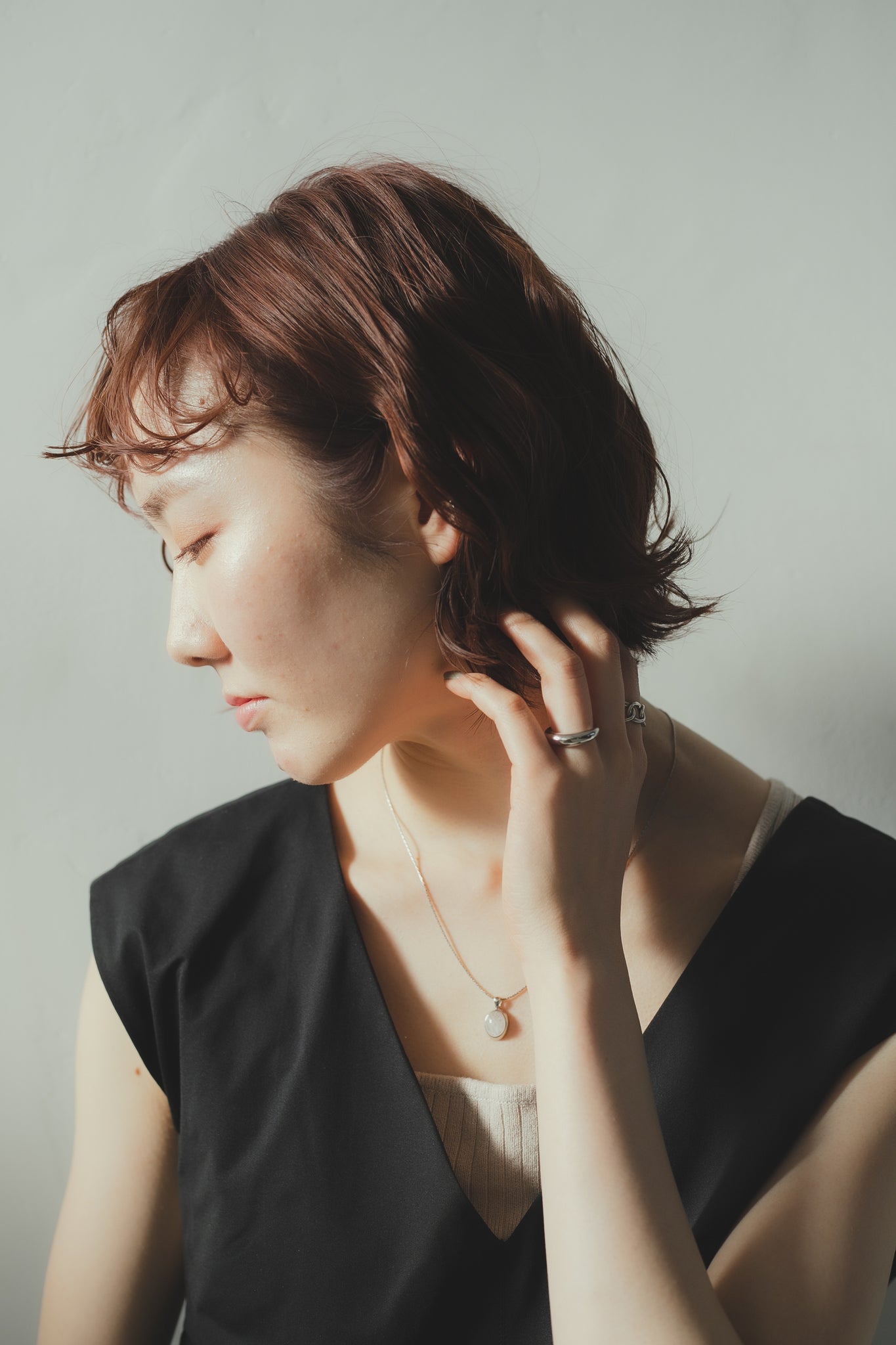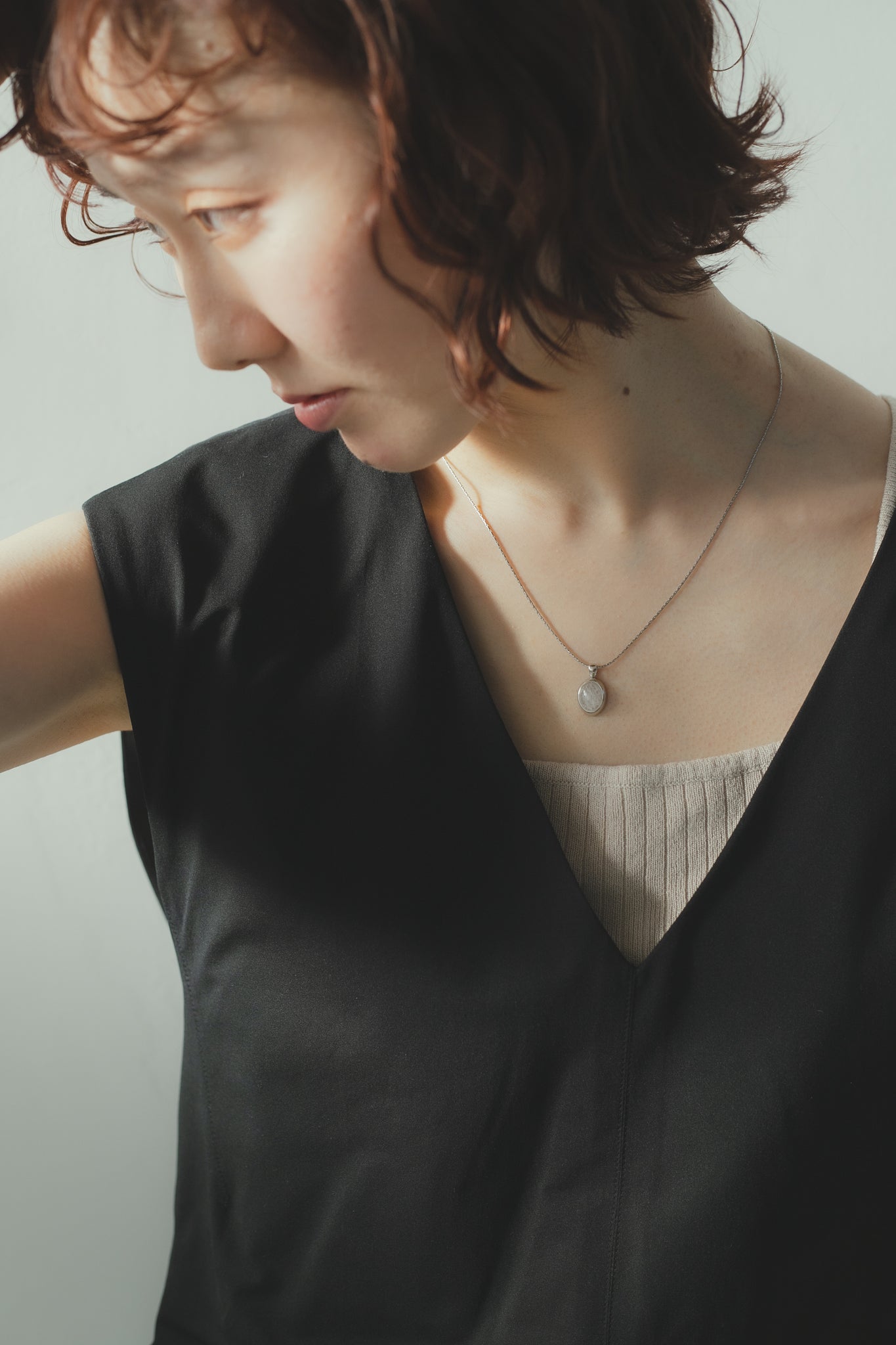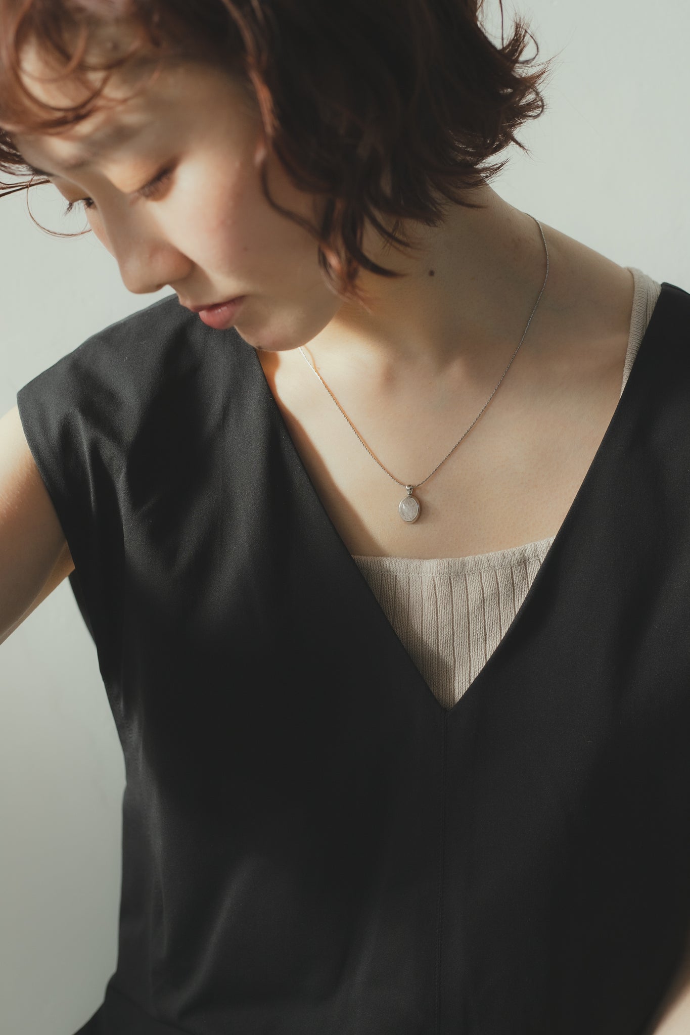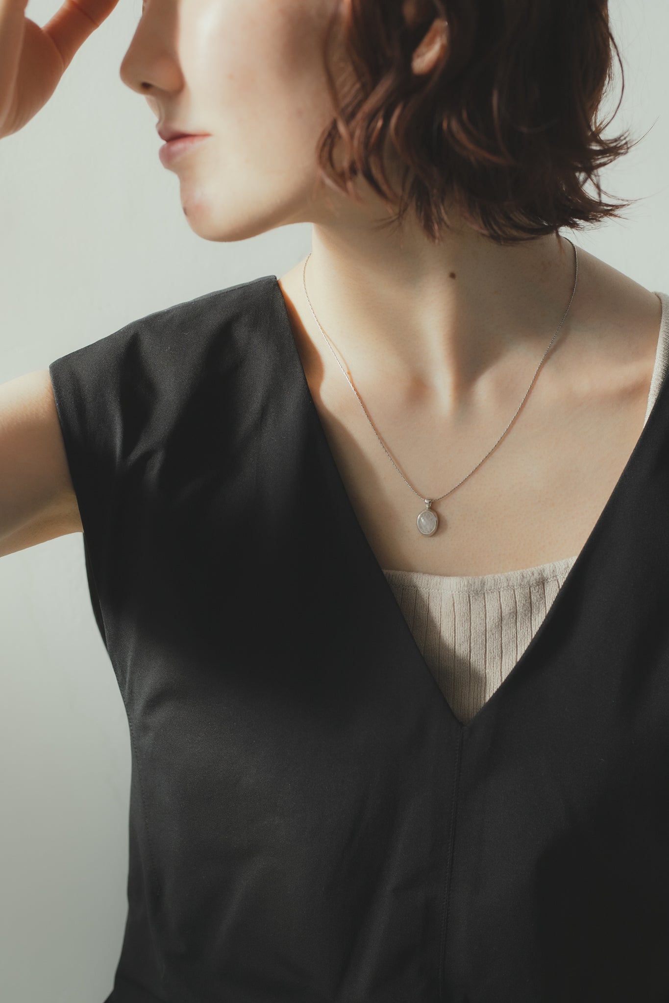 同じくホワイトクォーツを用いたリングと合わせてもお洒落で、首元を明るく綺麗に見せてくれ、大人カジュアルな雰囲気にもぴったりです◎