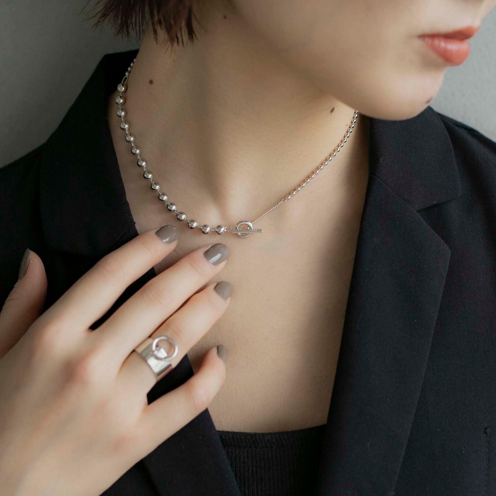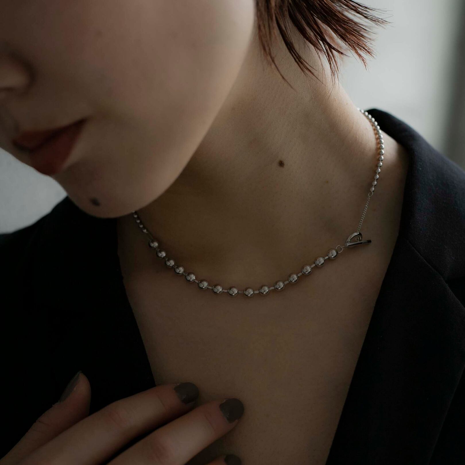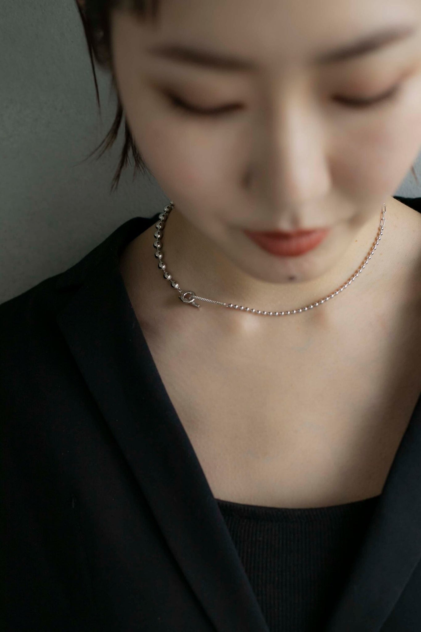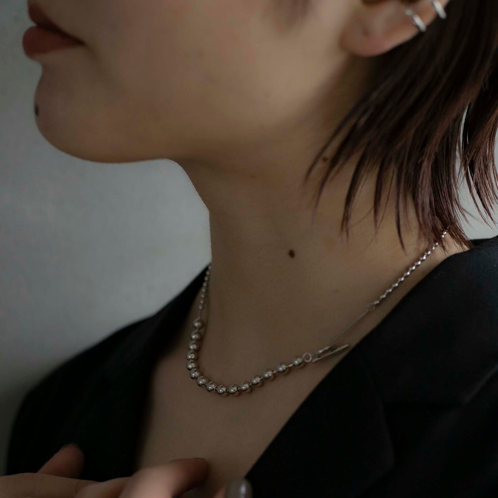 大きさの異なるボールチェーンの切り替えと留め具のアクセントがとてもお洒落なネックレスです!