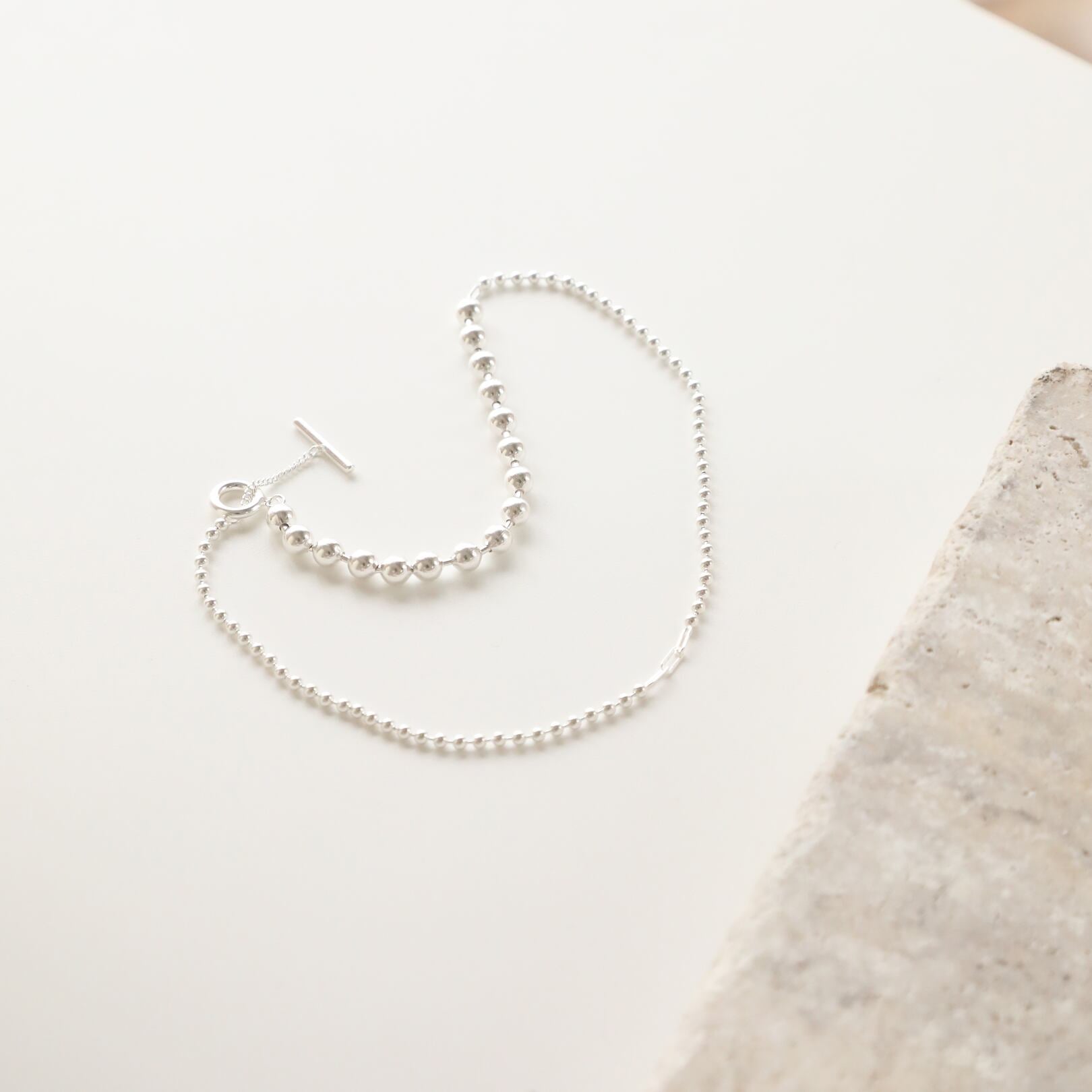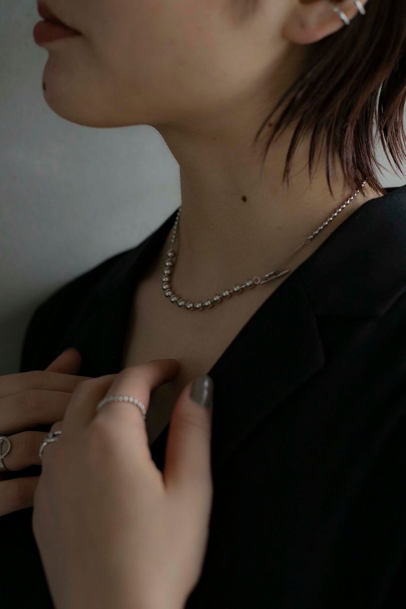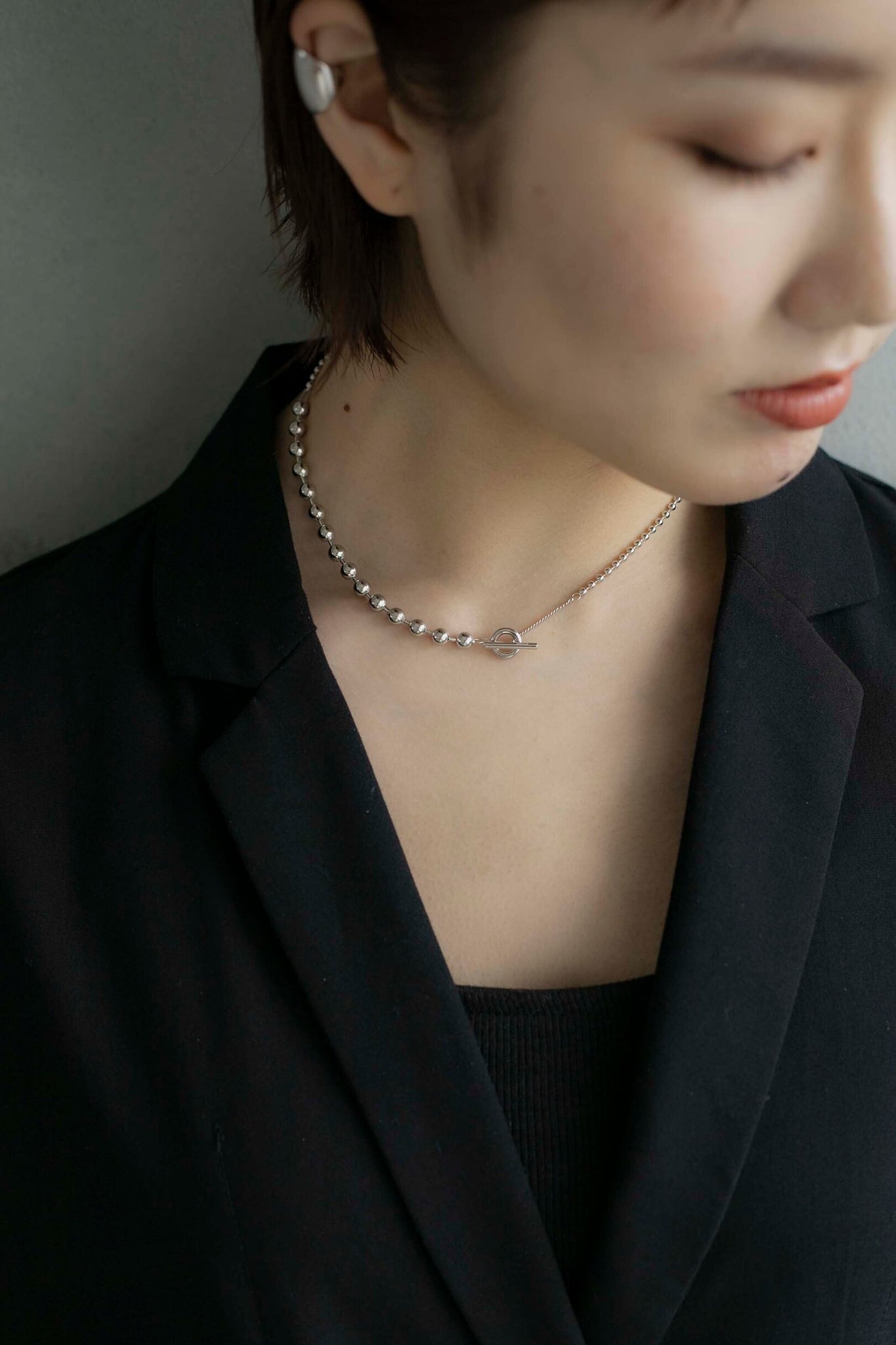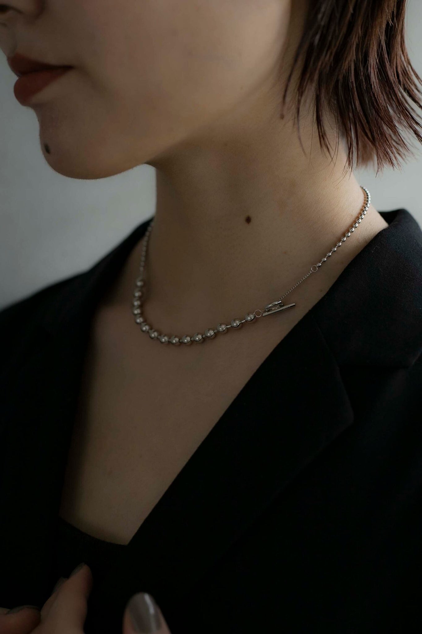 大きさの異なるボールチェーンの切り替えと留め具のアクセントがとてもお洒落なネックレスです!