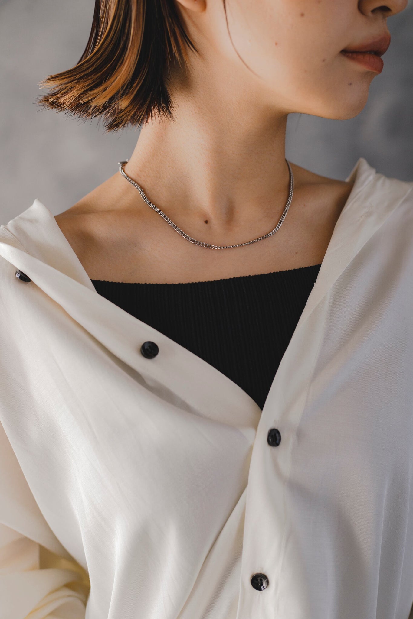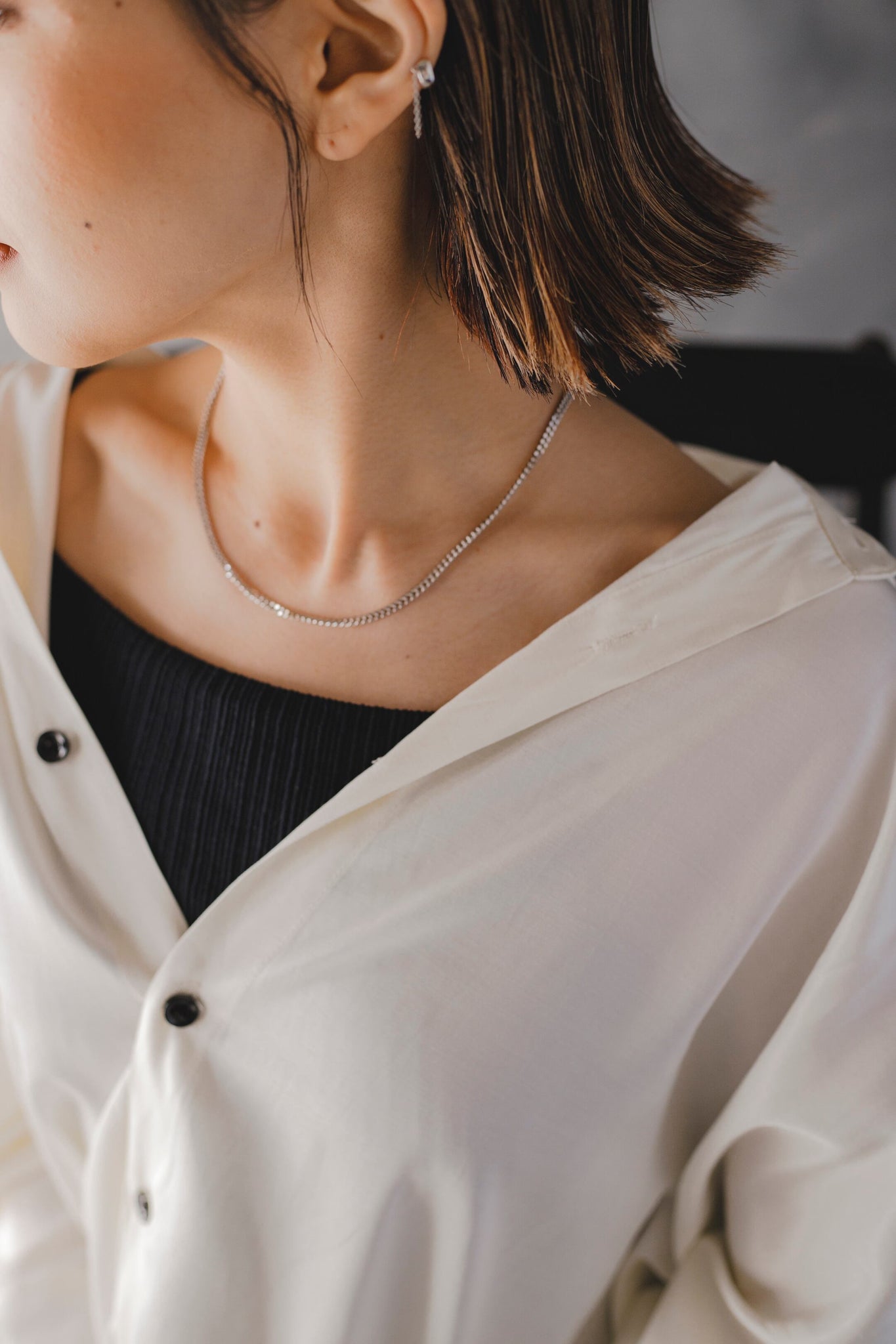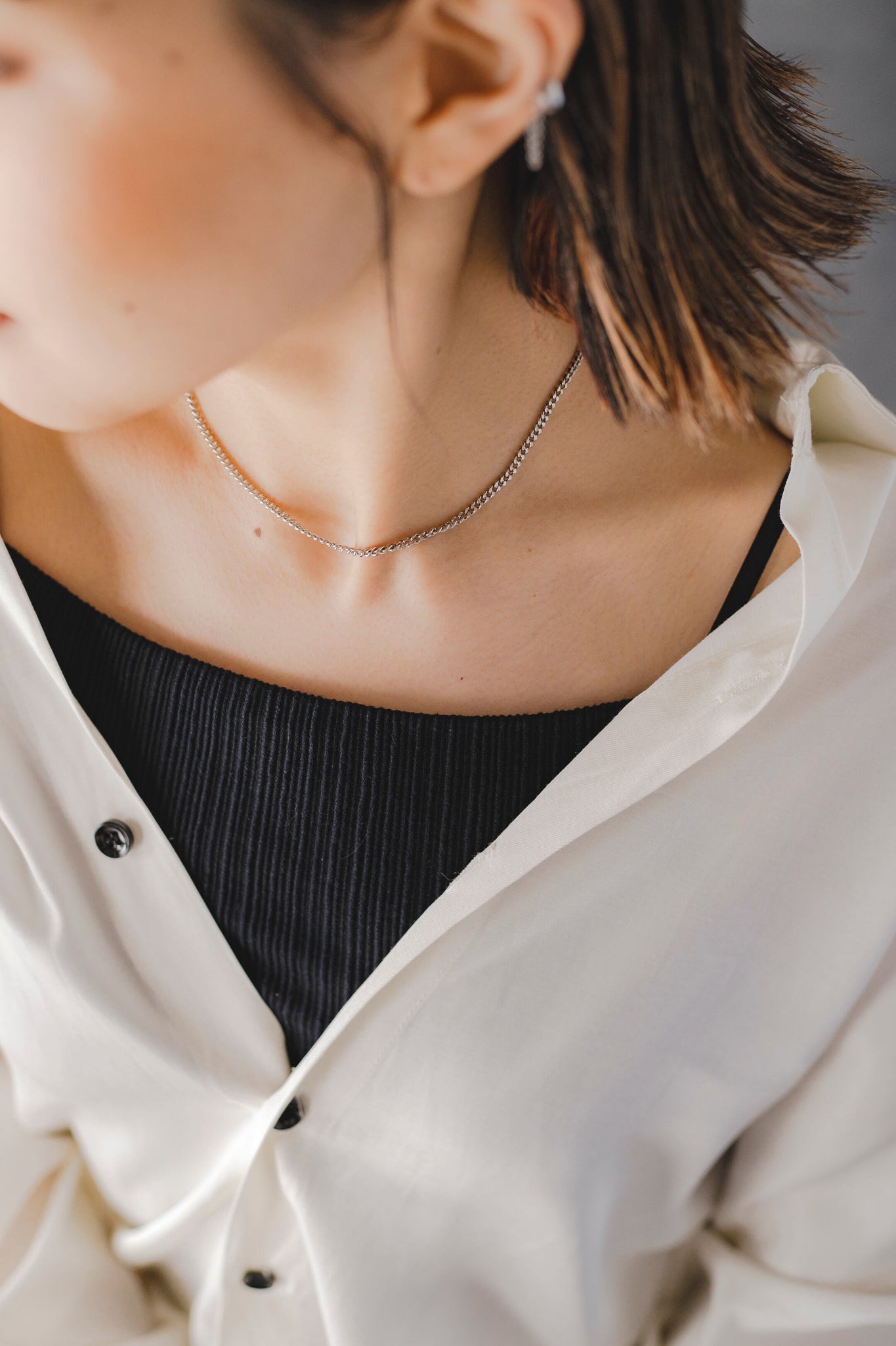 付属の調節用チェーンで長さを延長することも可能で、コンパクトなTシャツなどの首元にもぴったりです◎
