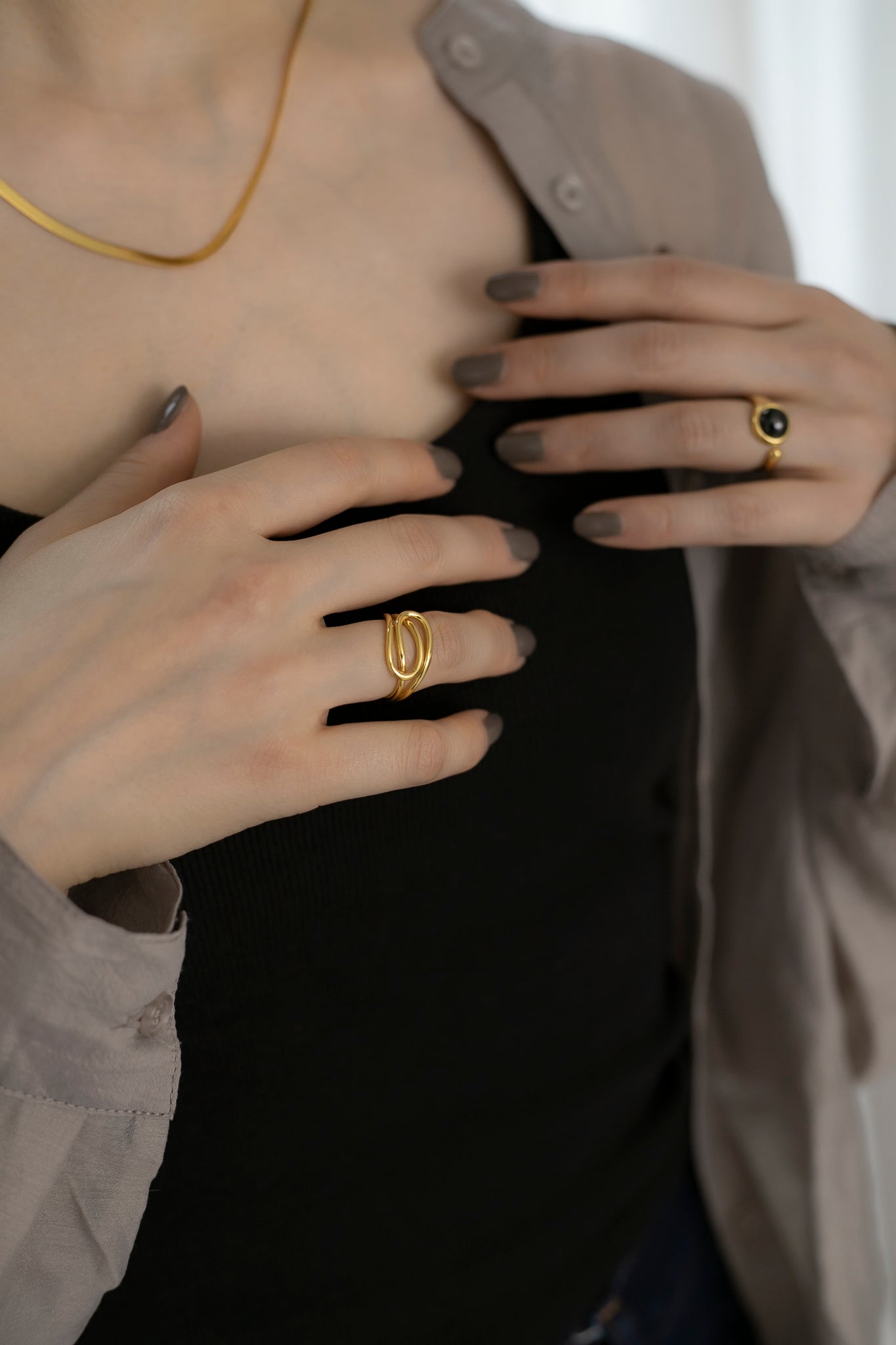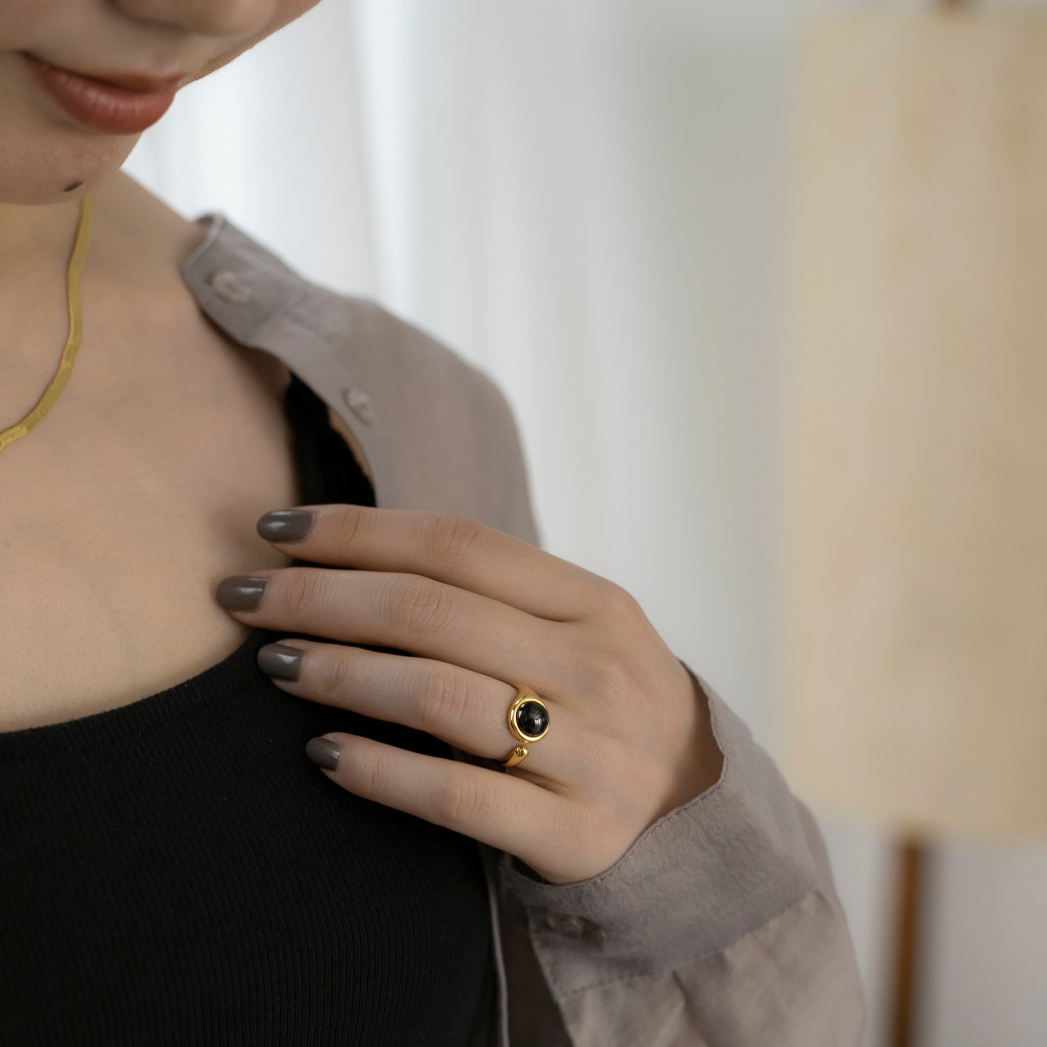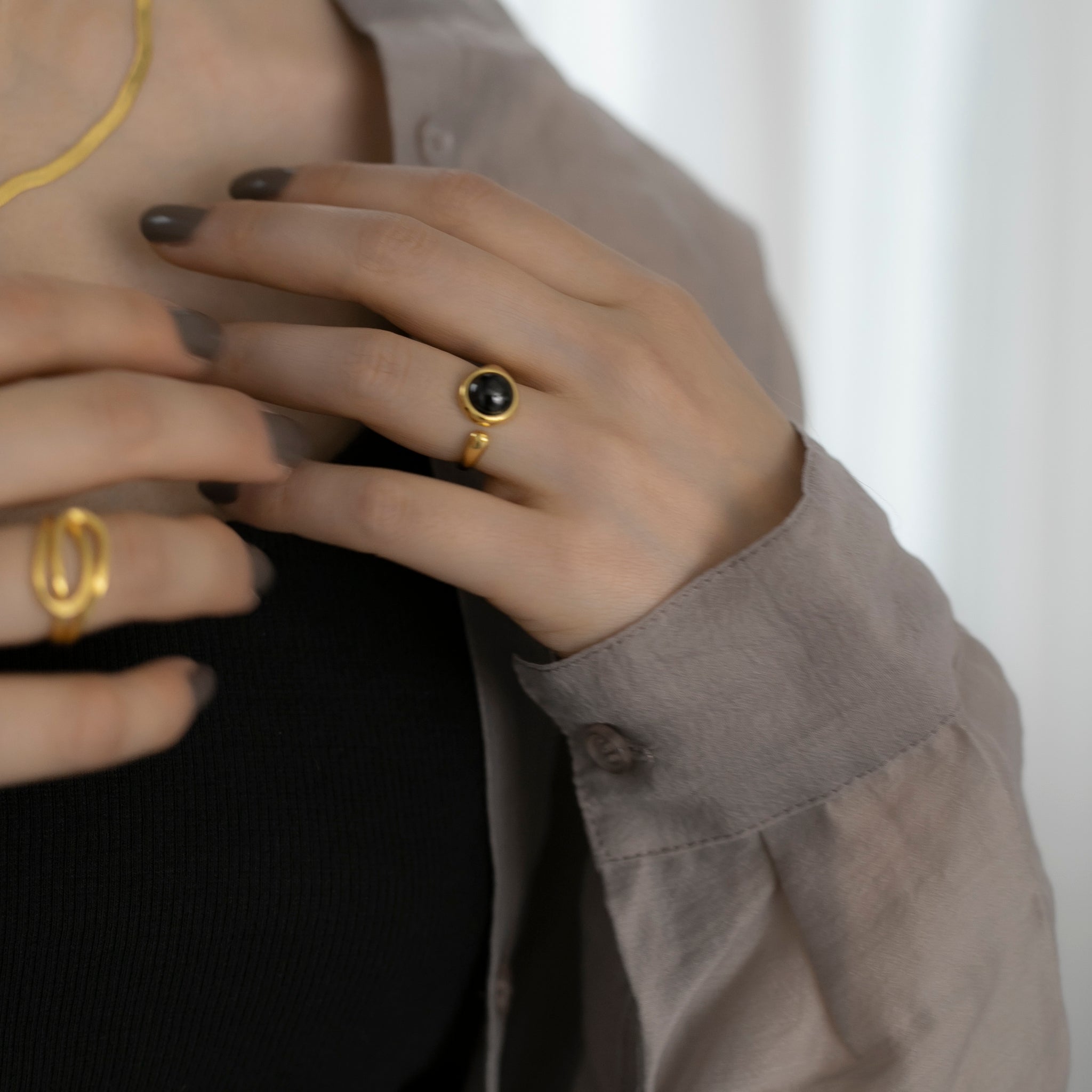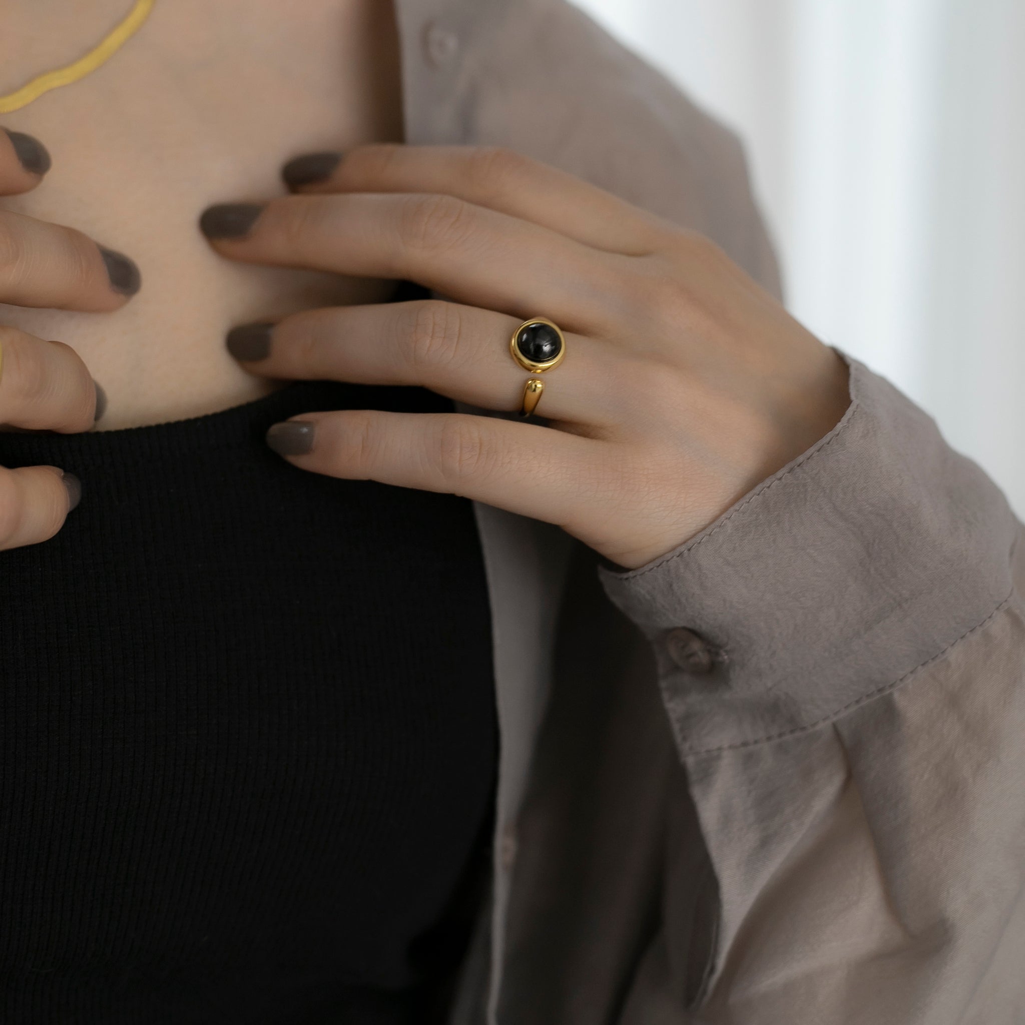 ストーンの絶妙な大きさとリングの抜け感により手指が綺麗に見え、人気のストーンを用いたアクセサリーの中でも普段のファッションに取り入れやすいと思います◎