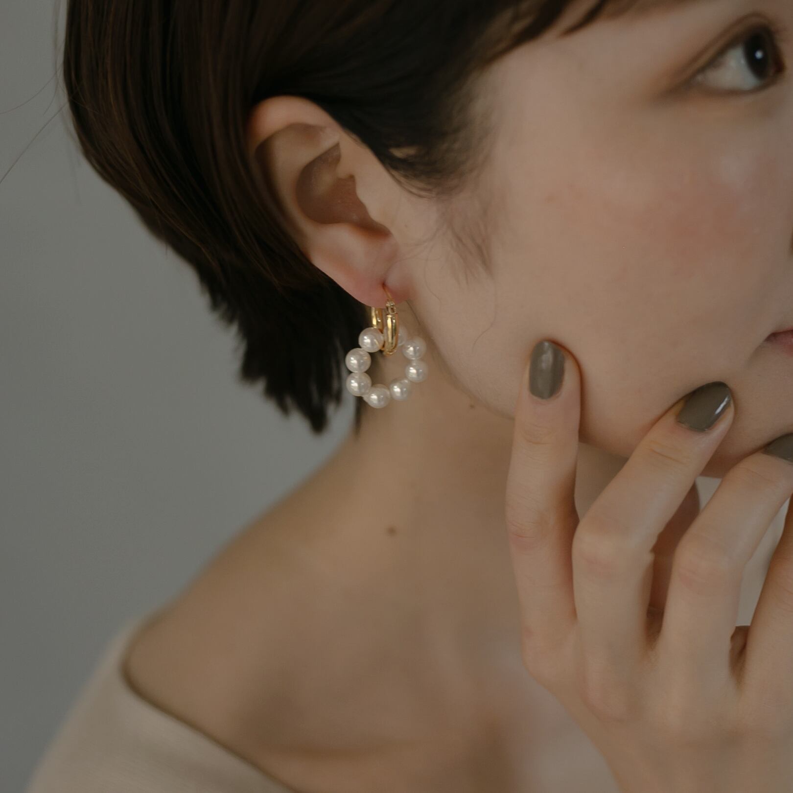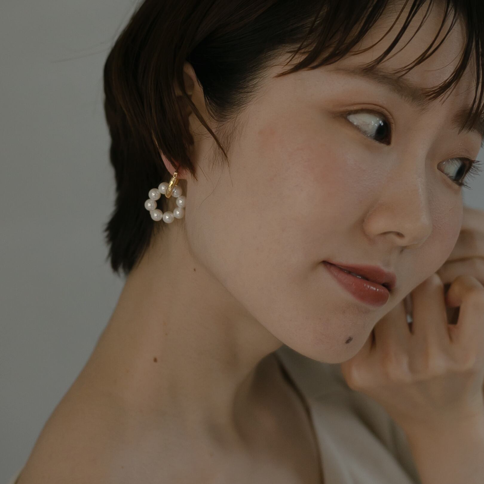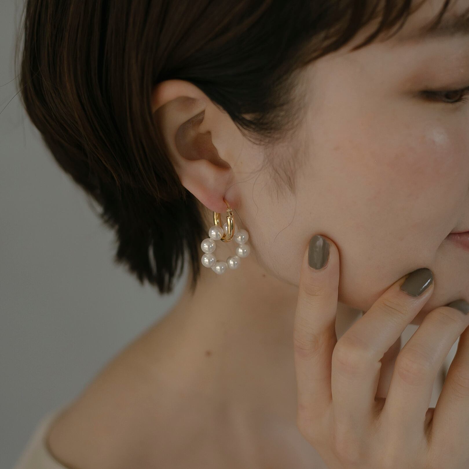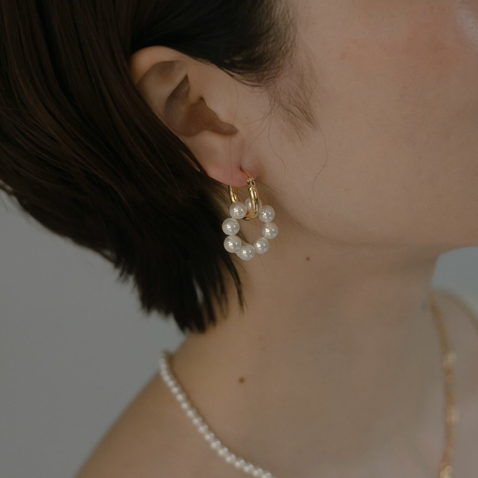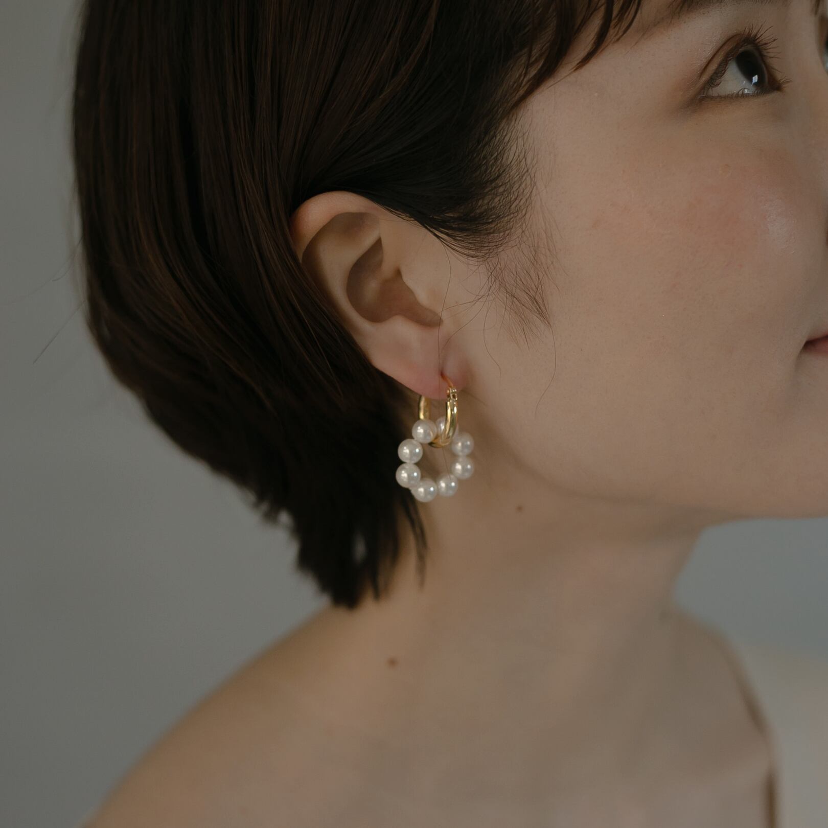 トレンドのパールのリングとゴールドの組み合わせがとても可愛らしく、顔周りをすっきり華やかに見せてくれるピアスです!