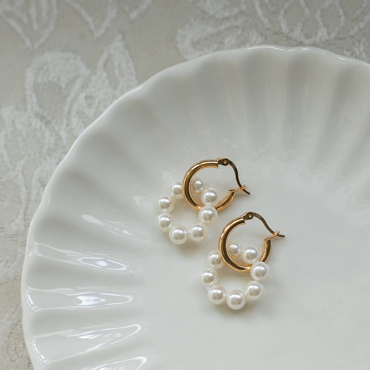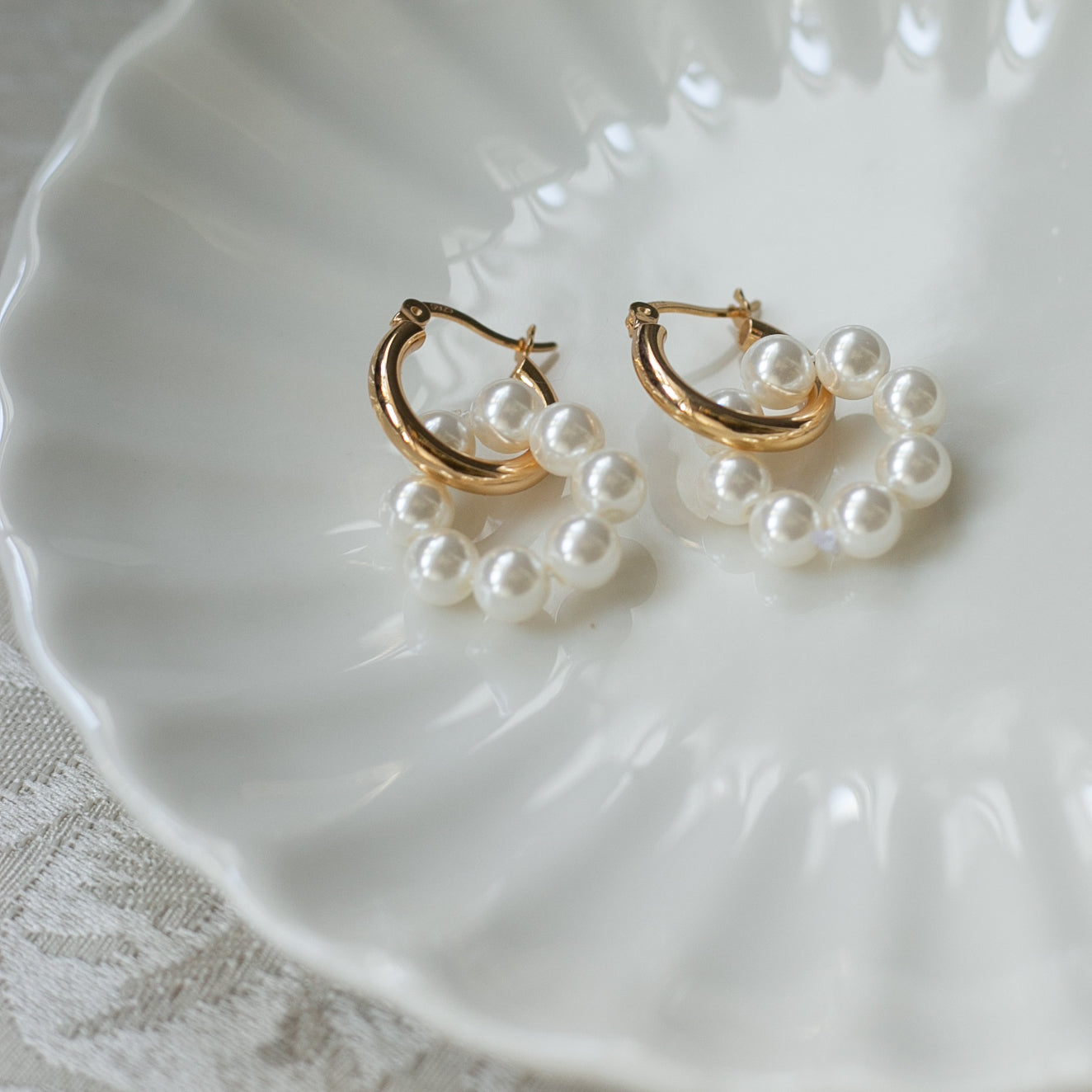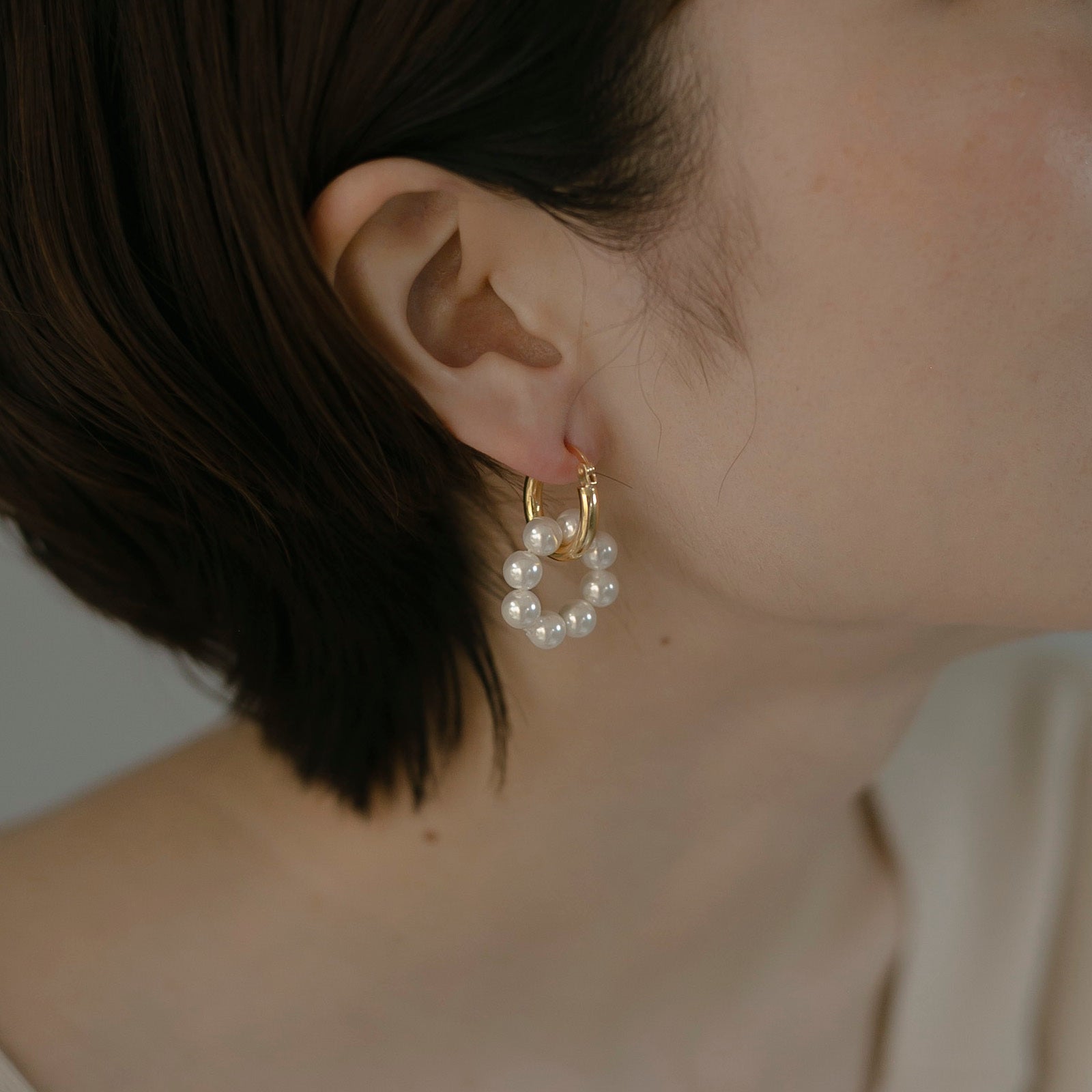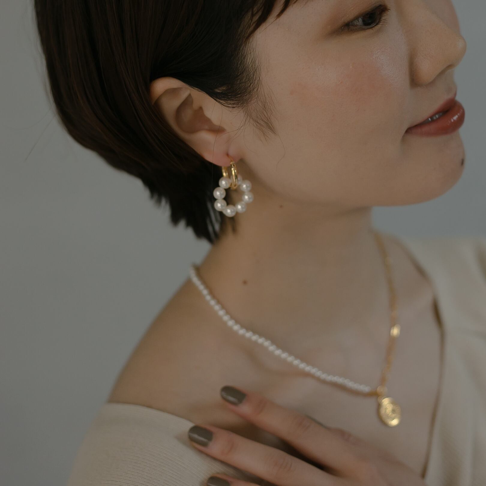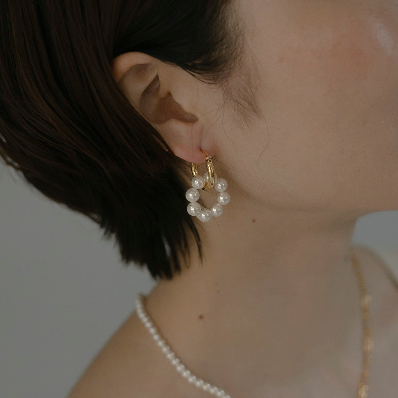 トレンドのパールのリングとゴールドの組み合わせがとても可愛らしく、顔周りをすっきり華やかに見せてくれるピアスです!