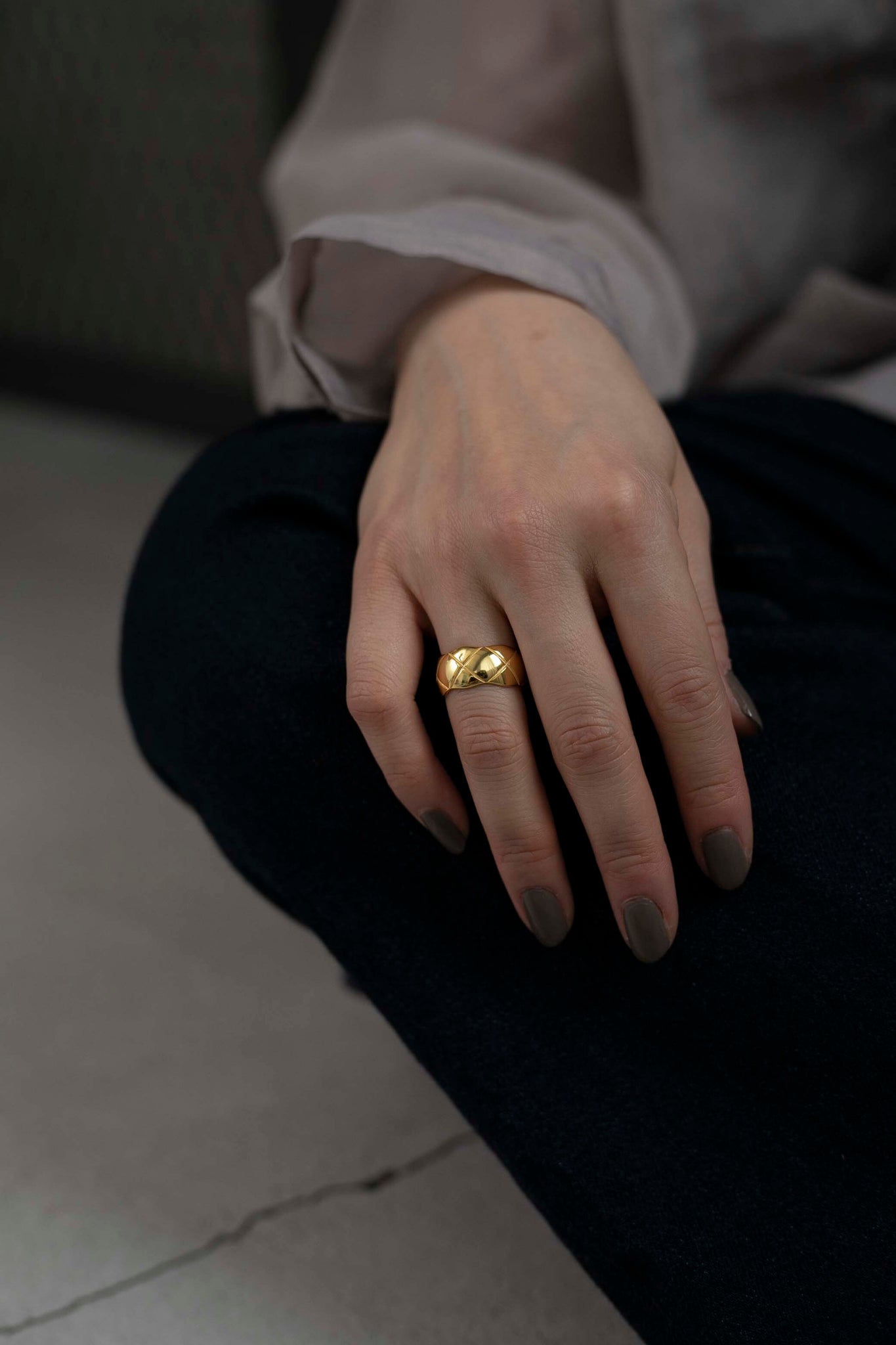 丸みを帯びたフォルムにキルティングのようなクロスデザインがとても可愛いリングになります!