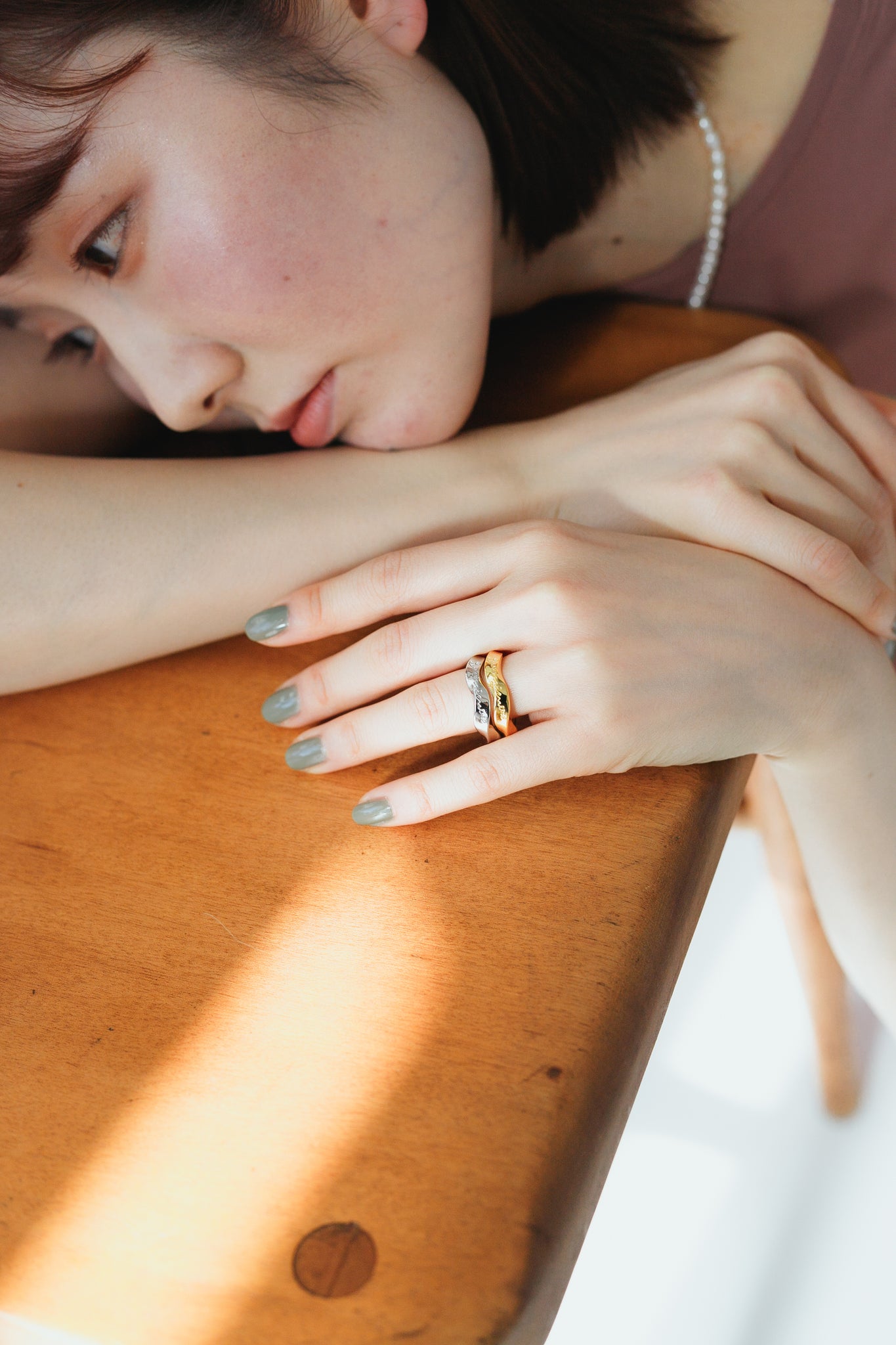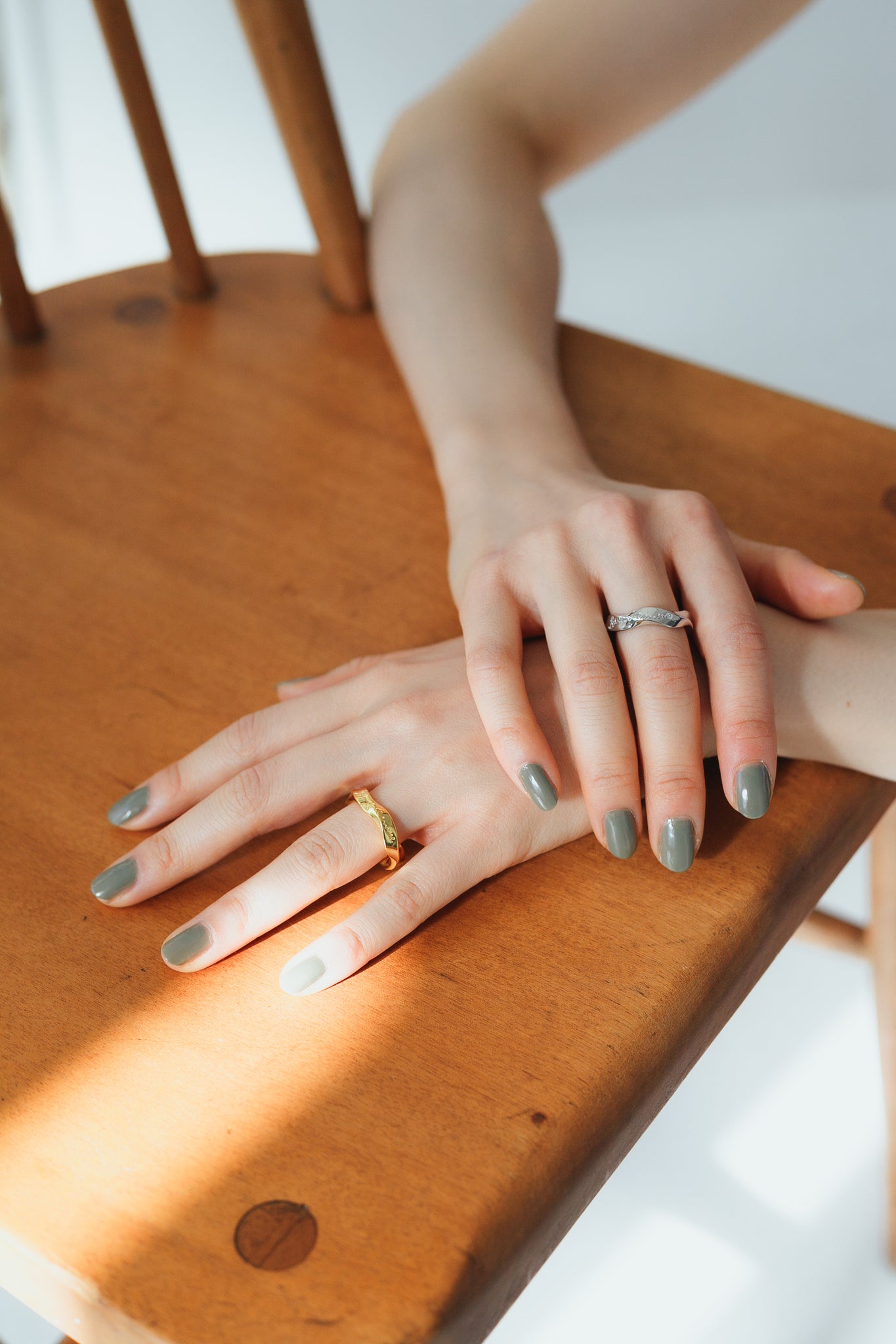 写真のように同じリング同士を合わせたり重ね付けしてもお洒落で、手元に存在感を与えてくれます◎