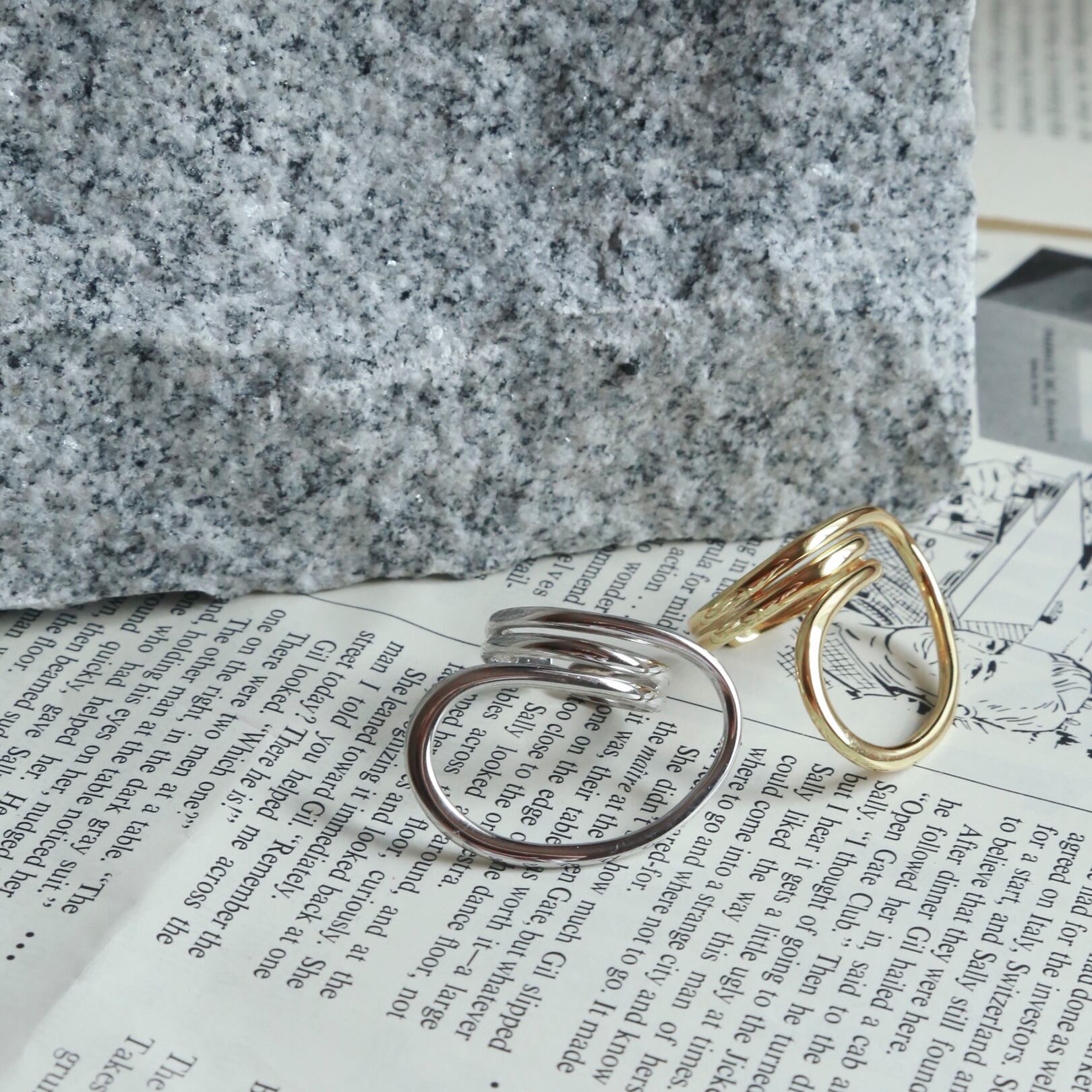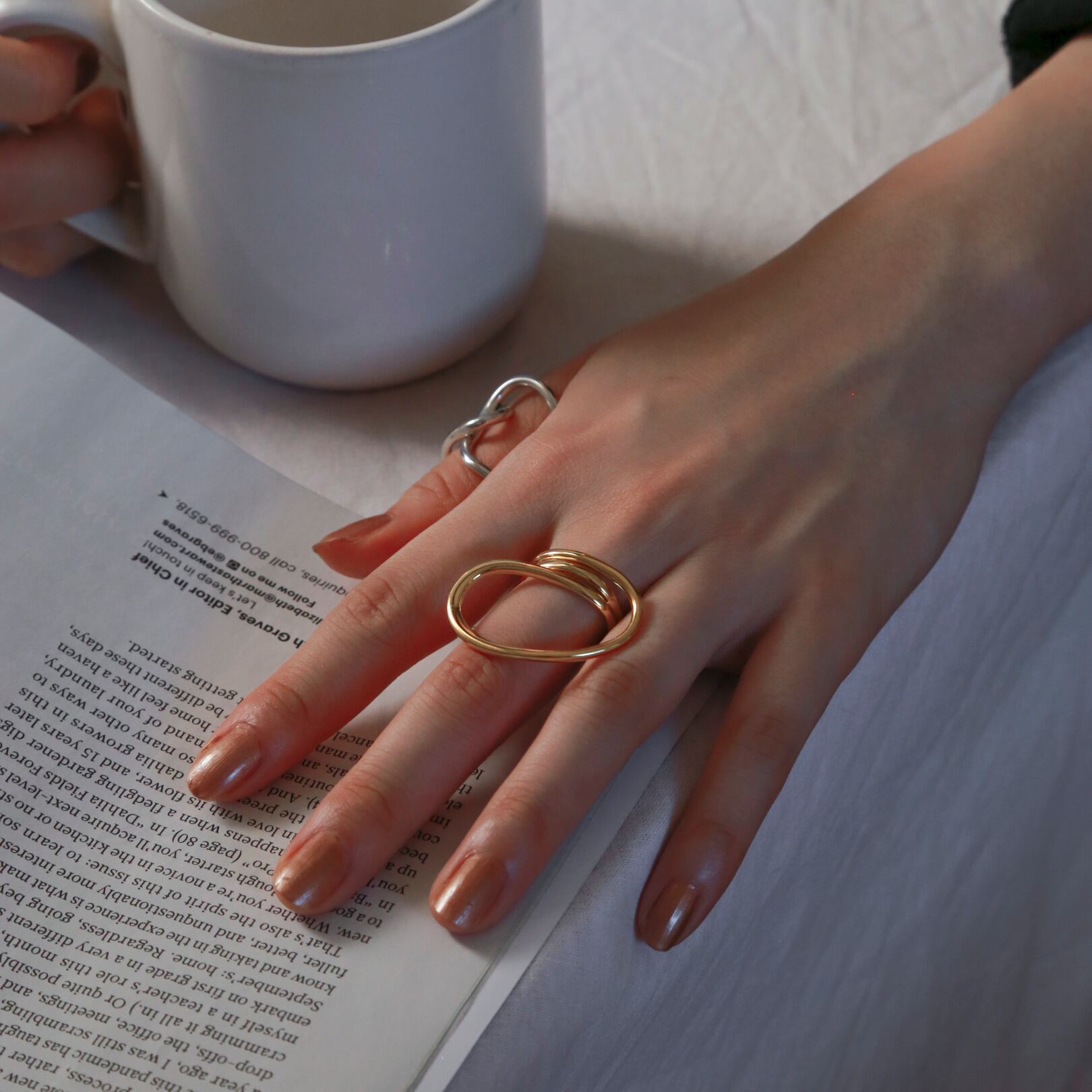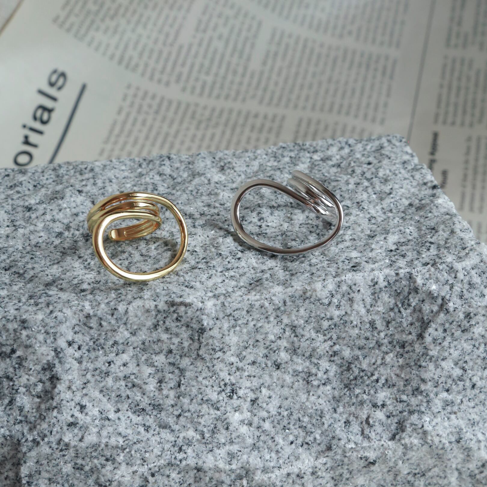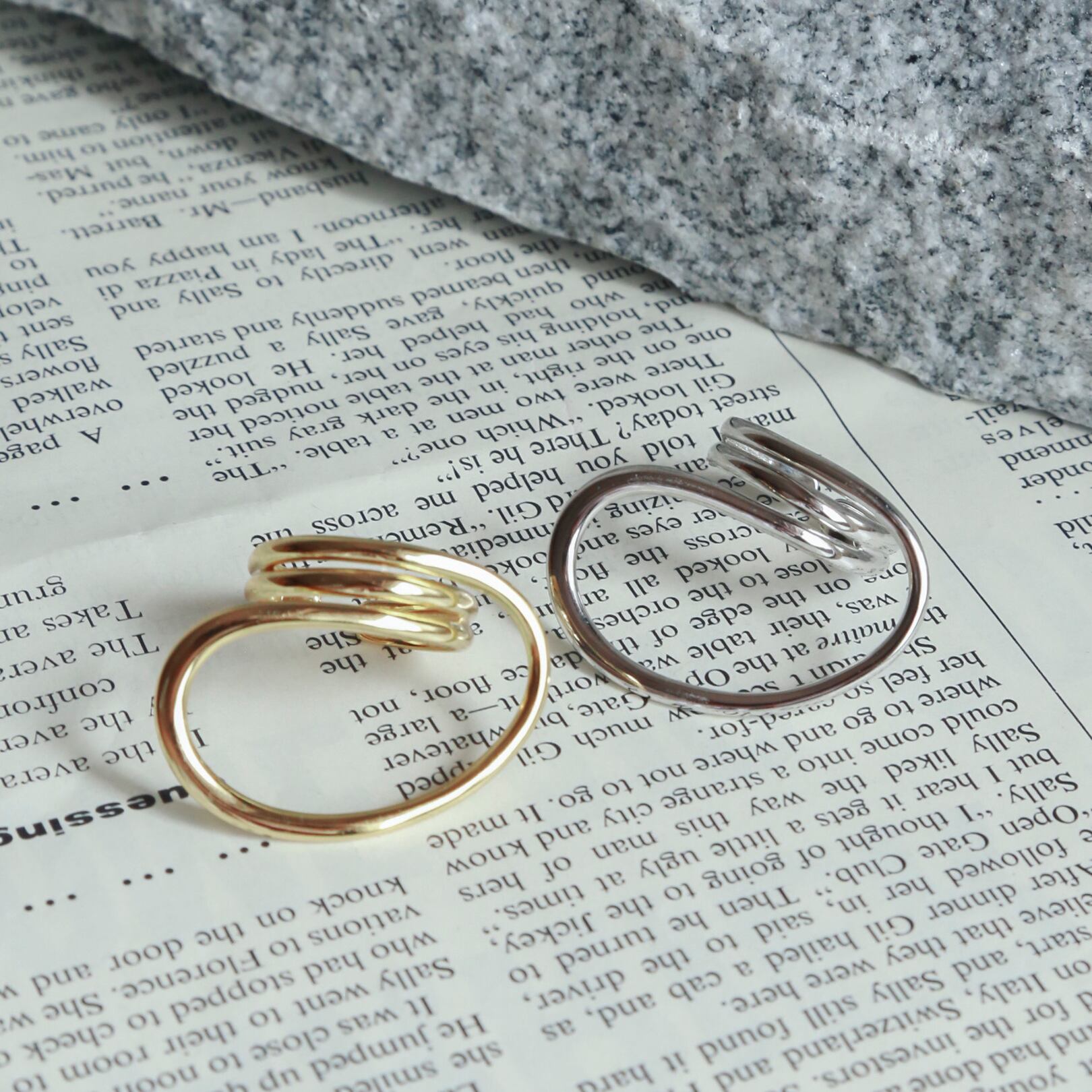 リング幅の近いもの同士や大きめのリング同士で合わせてもお洒落で、こなれ感のある手元を演出してくれます◎