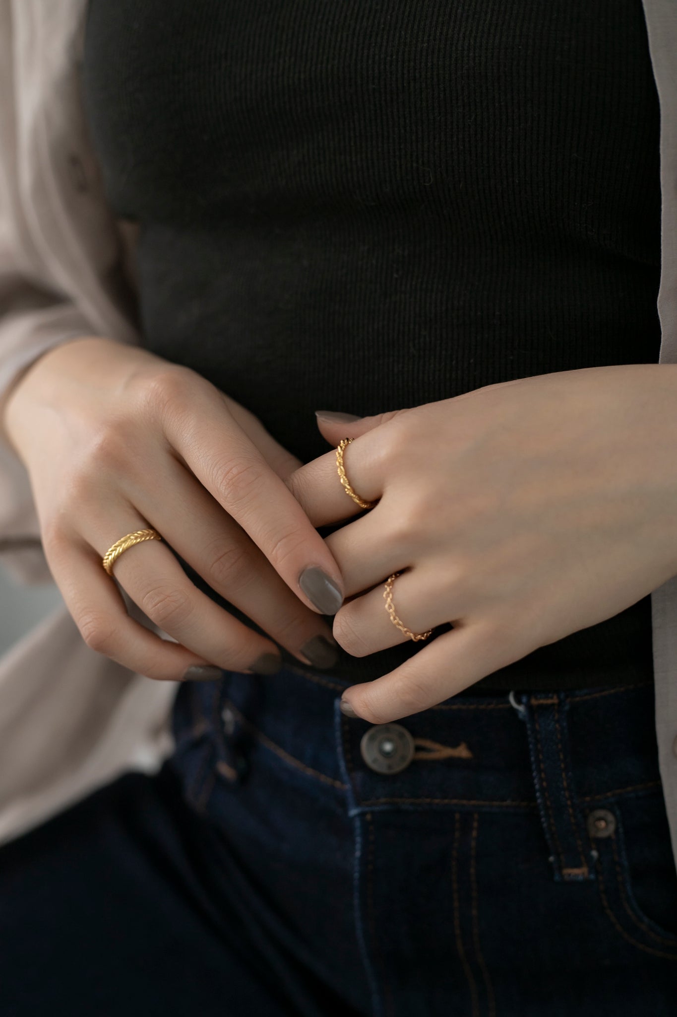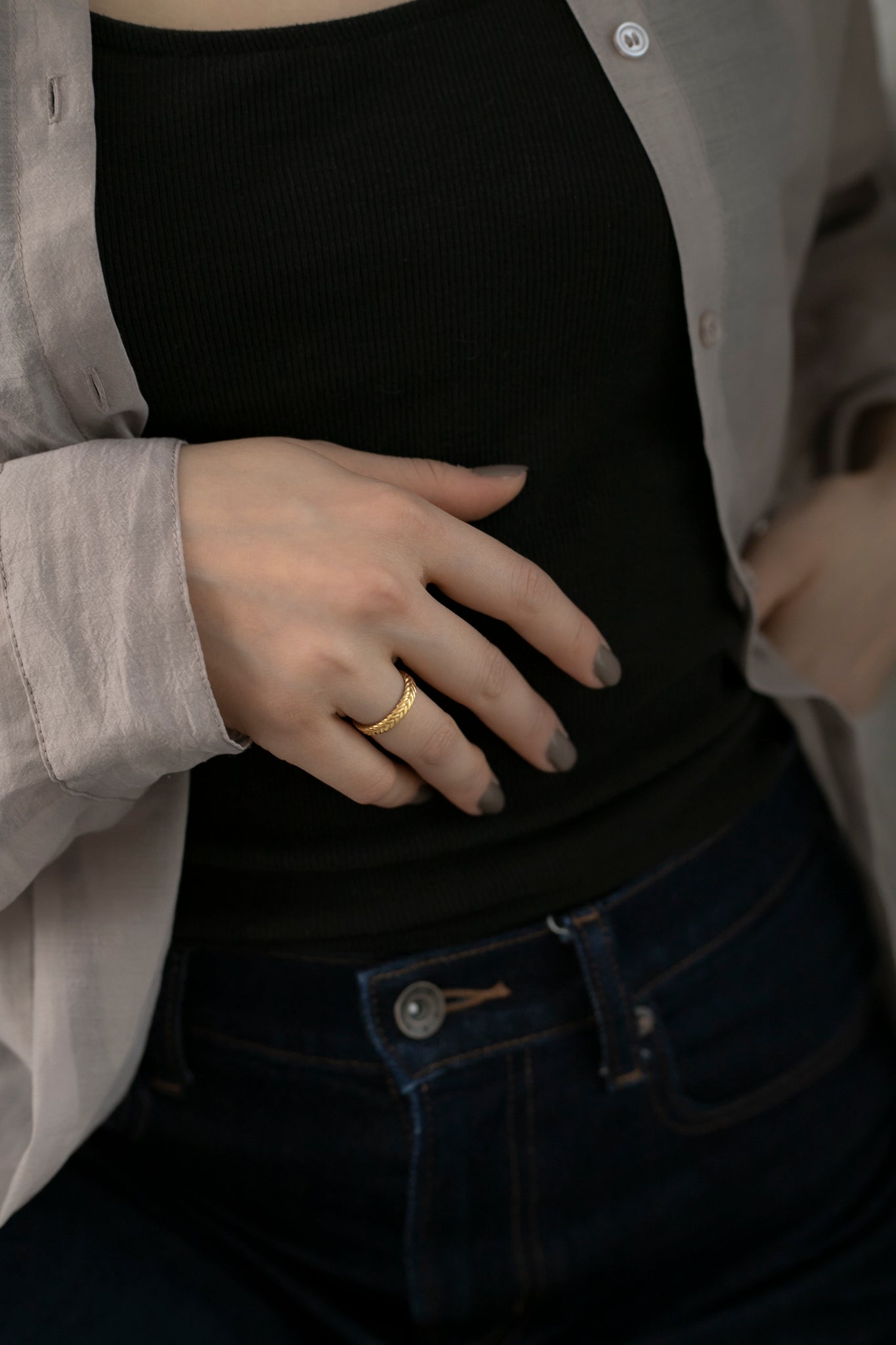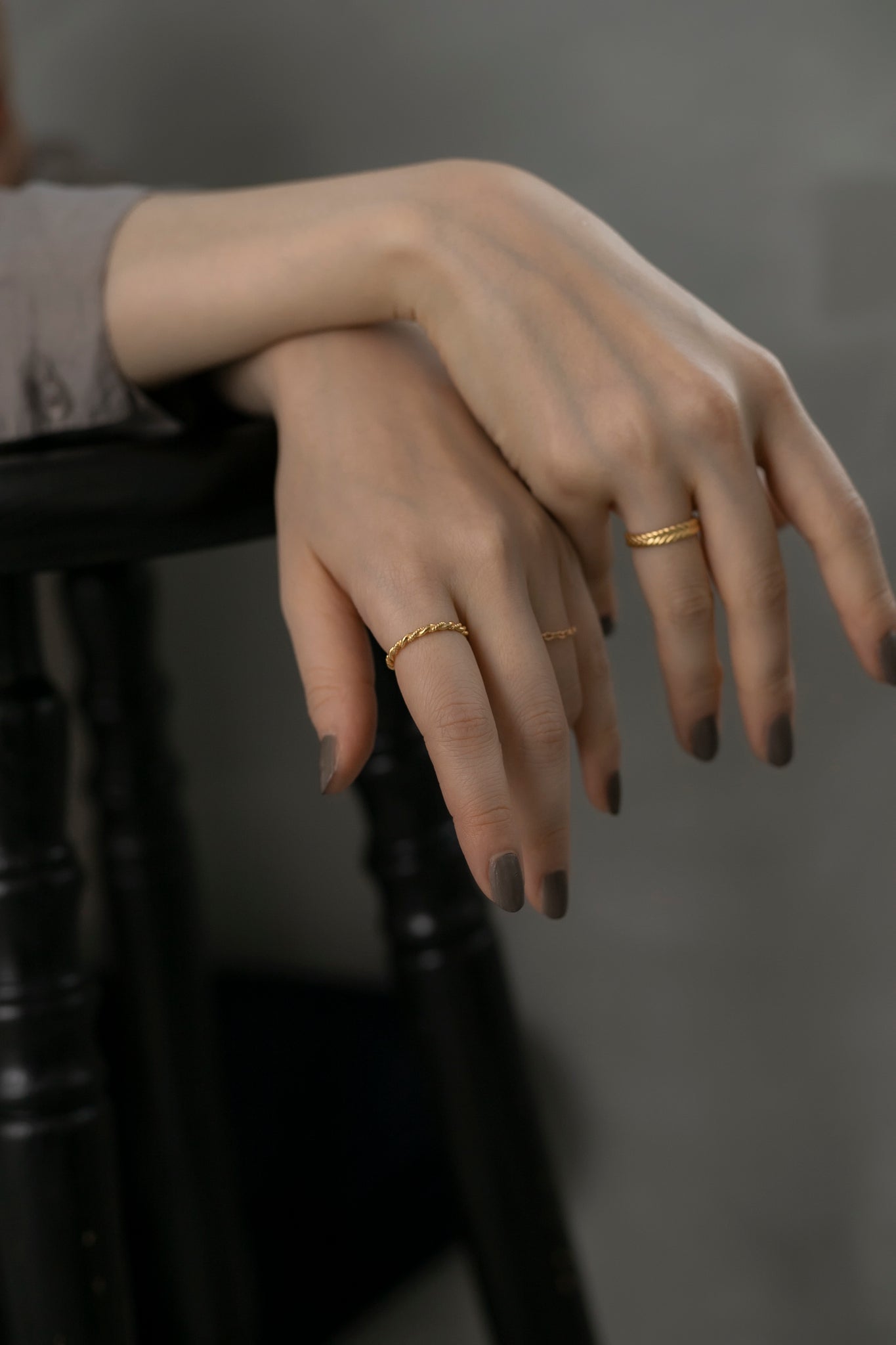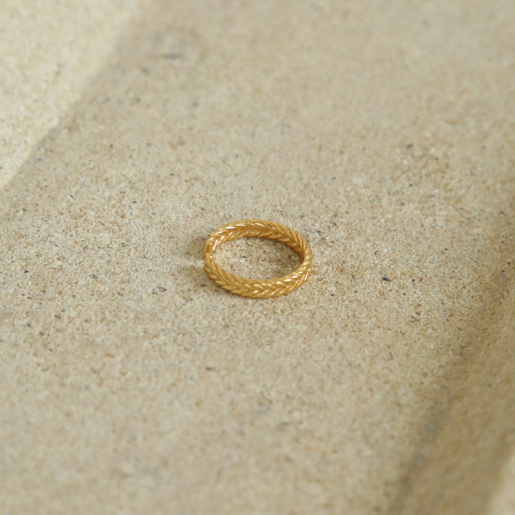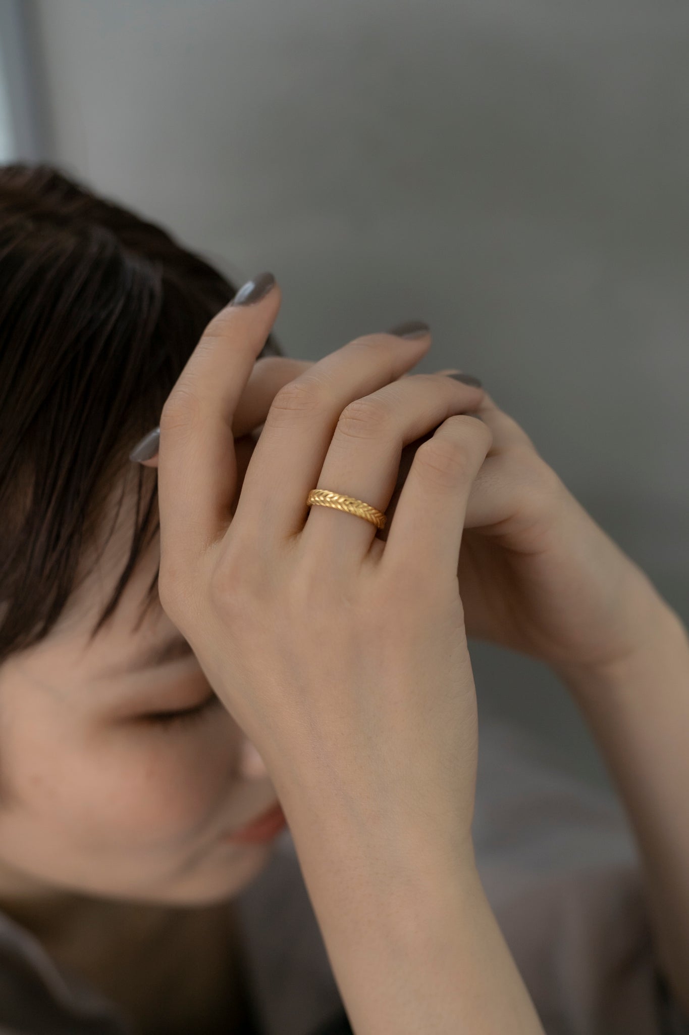 ヘアアレンジのフィッシュボーンを編んだようなデザインに肌なじみの良いオレンジゴールドのお色味がとても可愛いリングです!