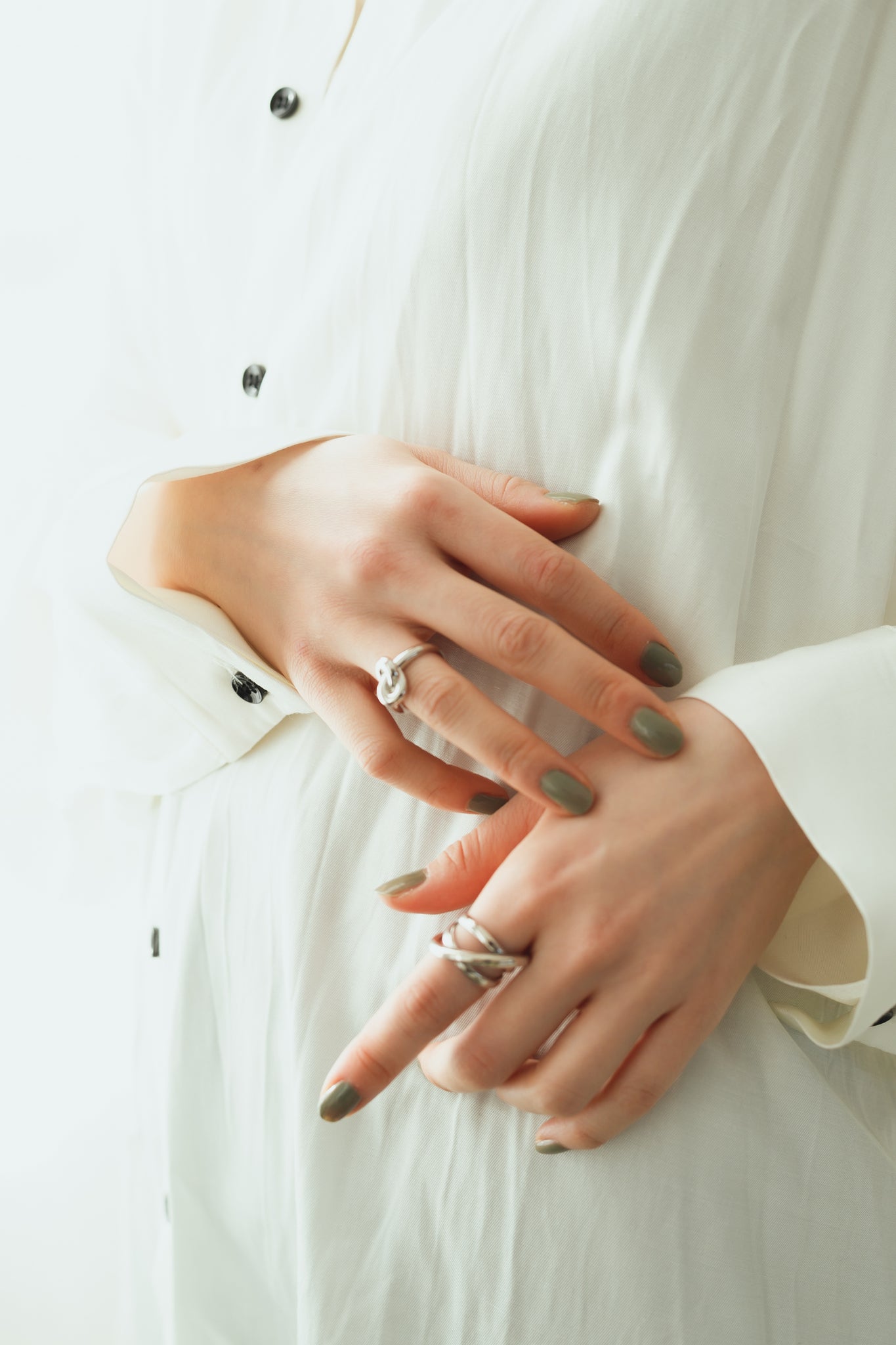 結び目以外の部分がすっきりしているために使いやすく、単体ではもちろん写真のようにリング幅の近いものと合わせていただくのも凄くおすすめです◎