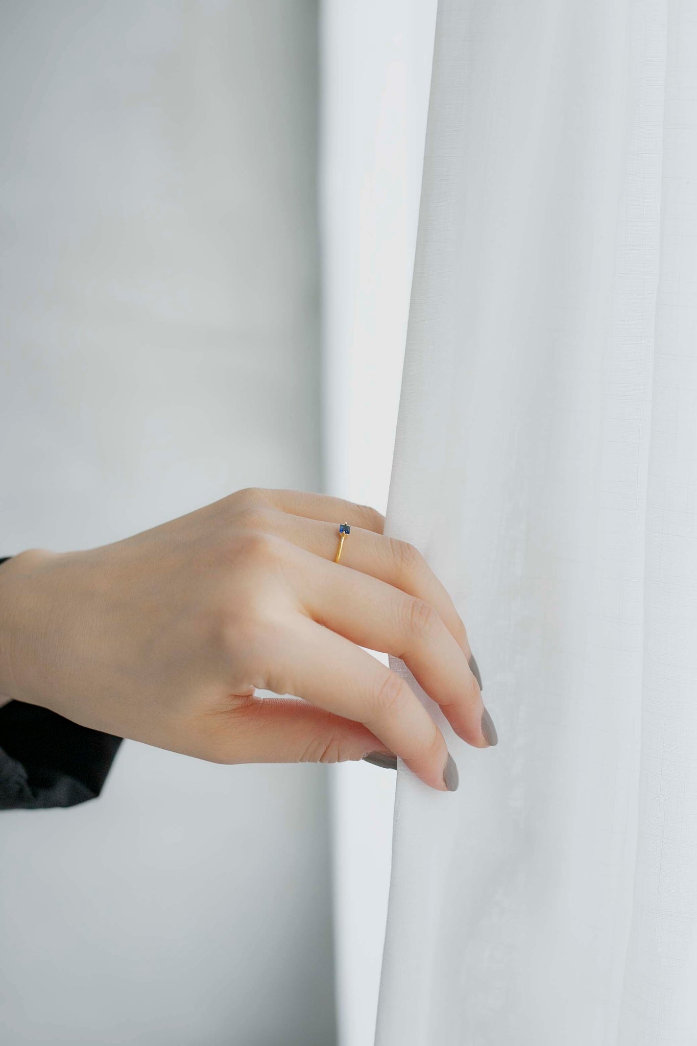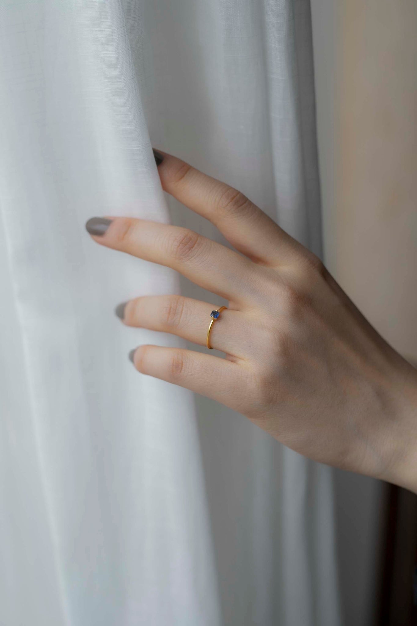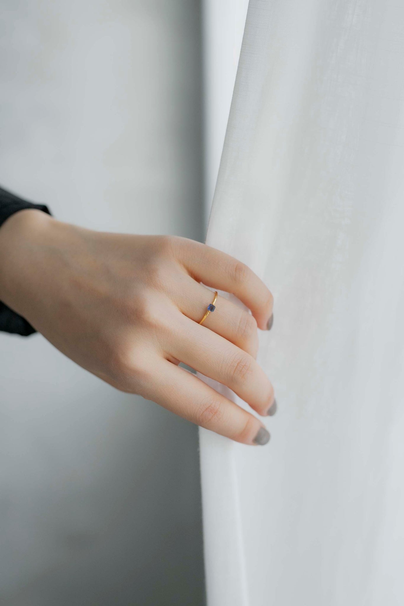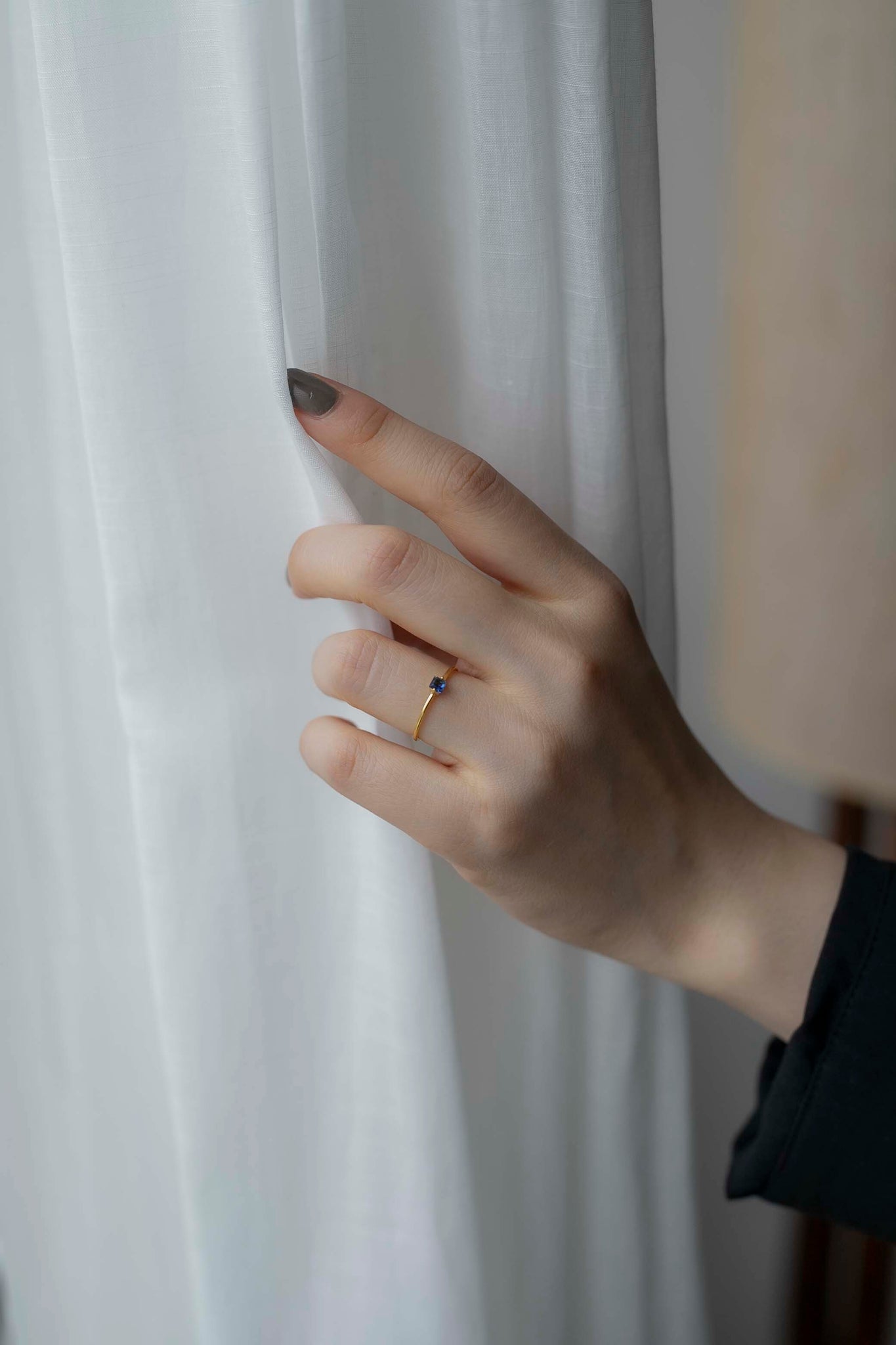 ゴールドにスクエアカットの青いジルコニアがとても可愛いリングになります!
