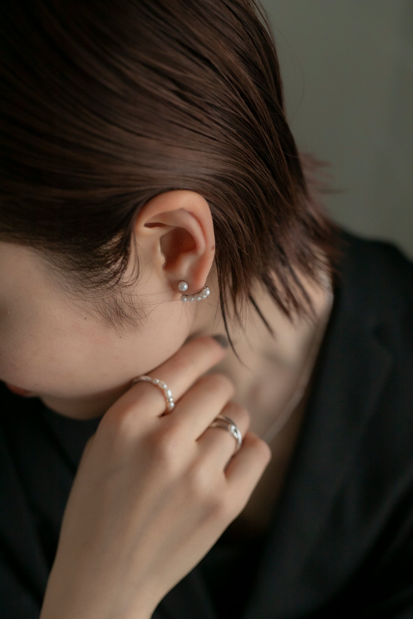 大きさが不揃いの淡水パールに少しエッジの効いたシルバーが甘くなりすぎず、エレガントにもカジュアルにも合わせていただけます◎
