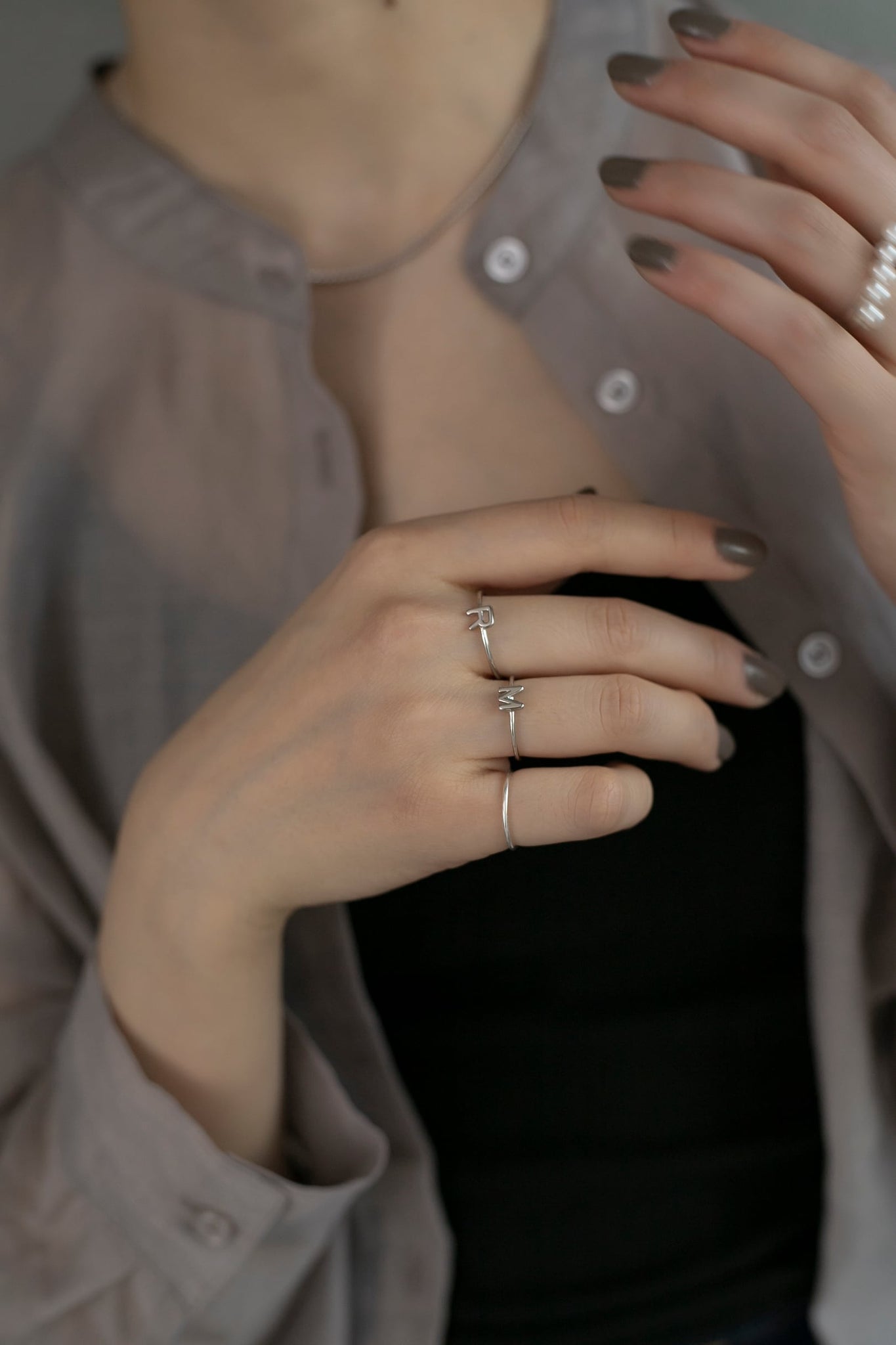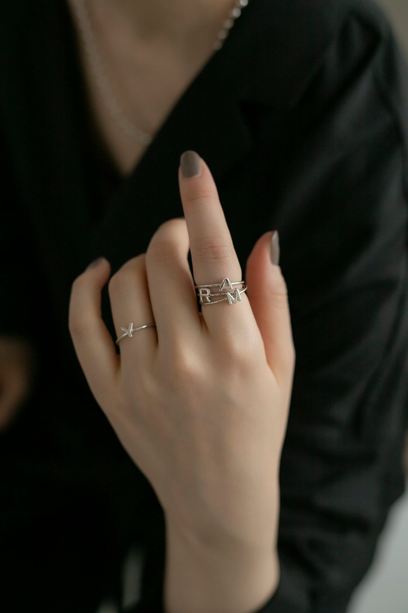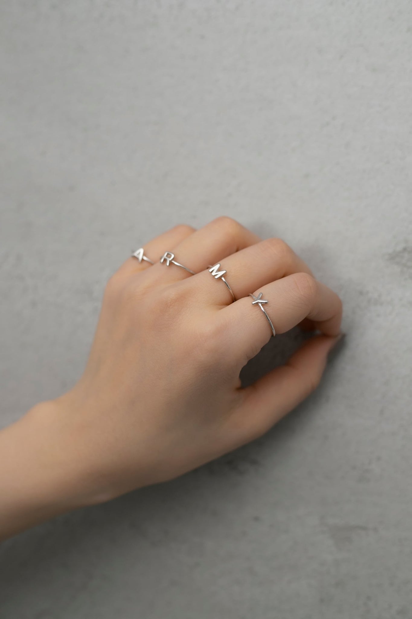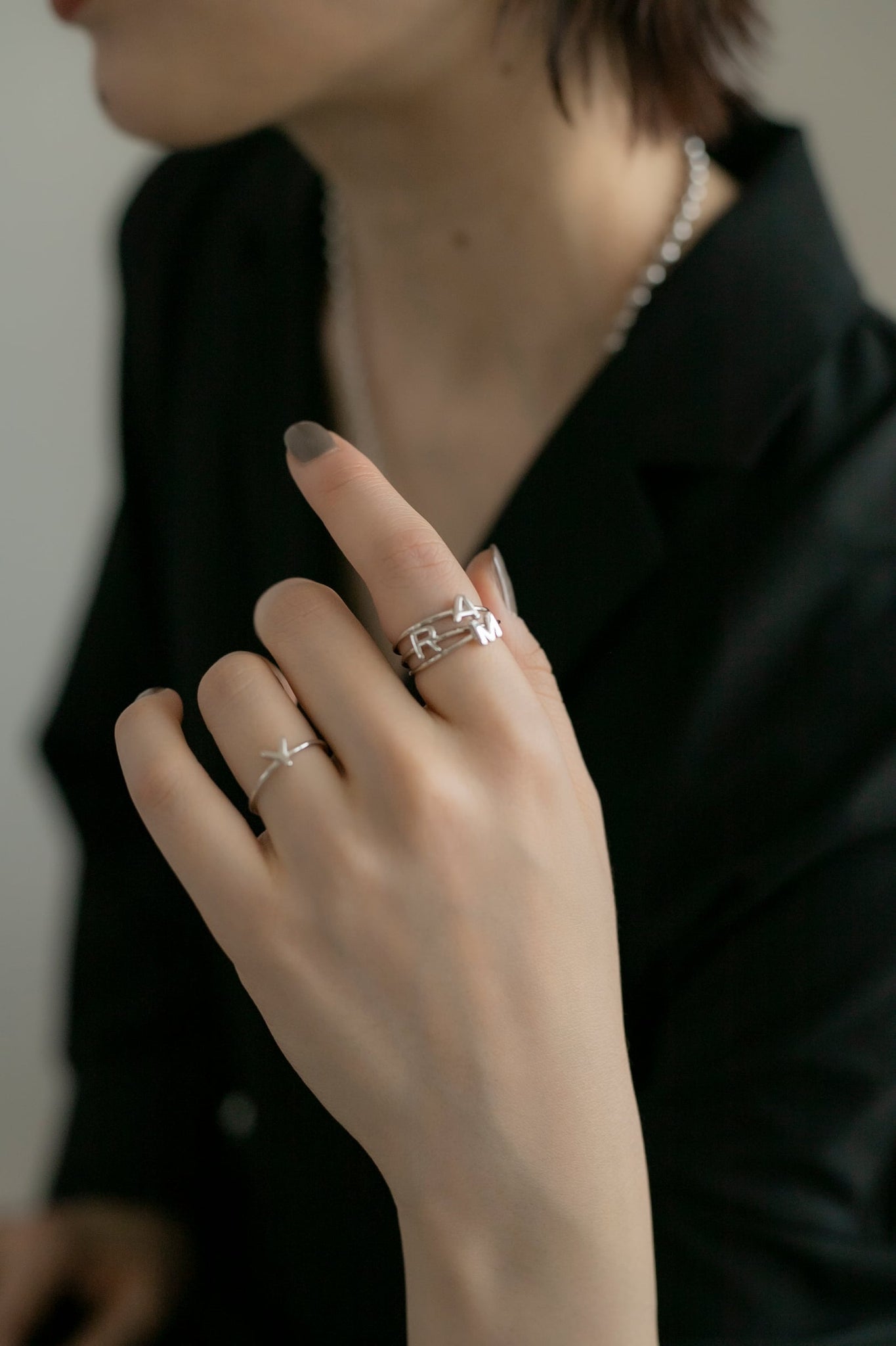 単体ではもちろん、写真のように重ね付けしたり他のリングとミックスしてつけても可愛いイニシャルリングです!