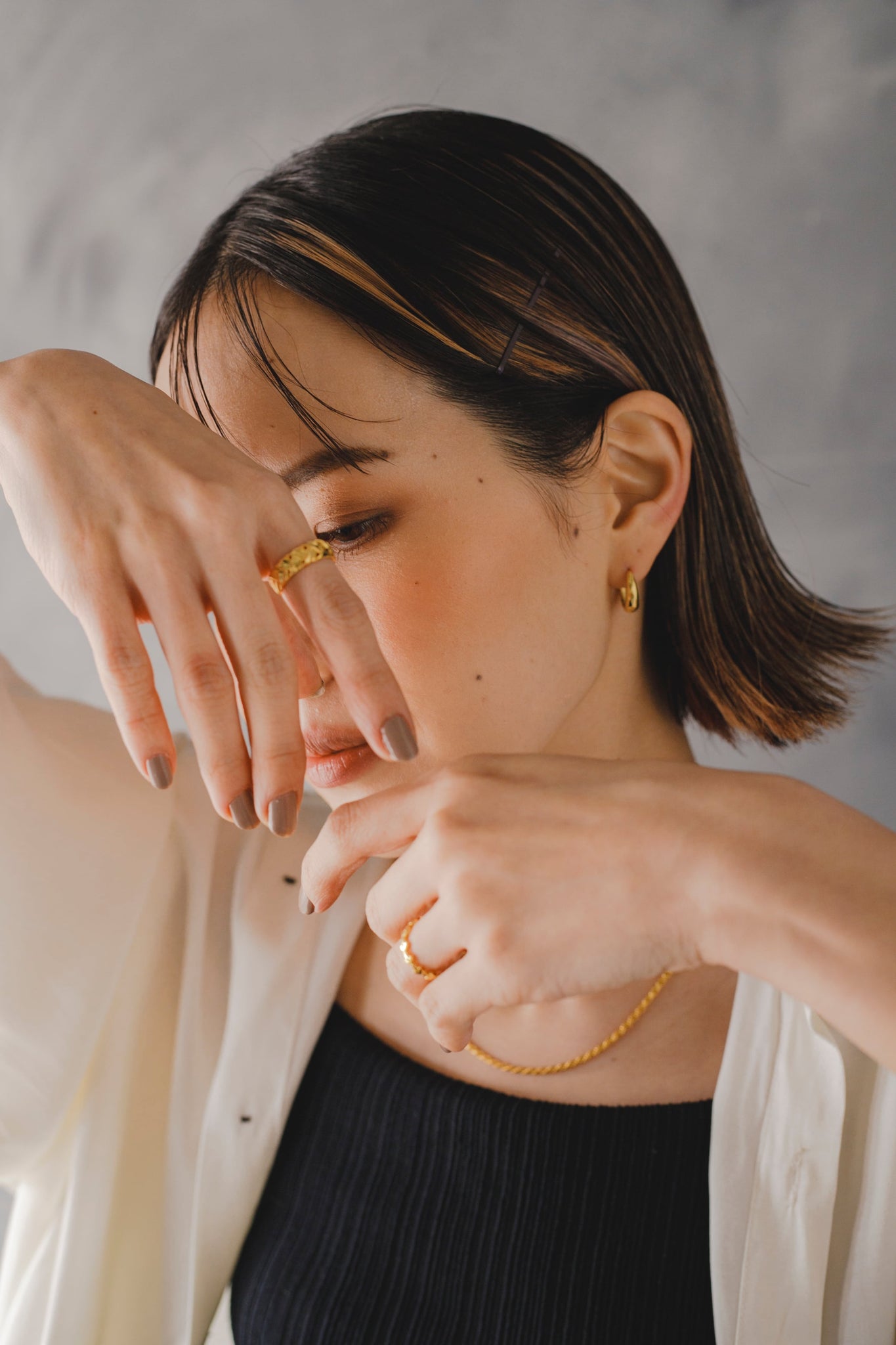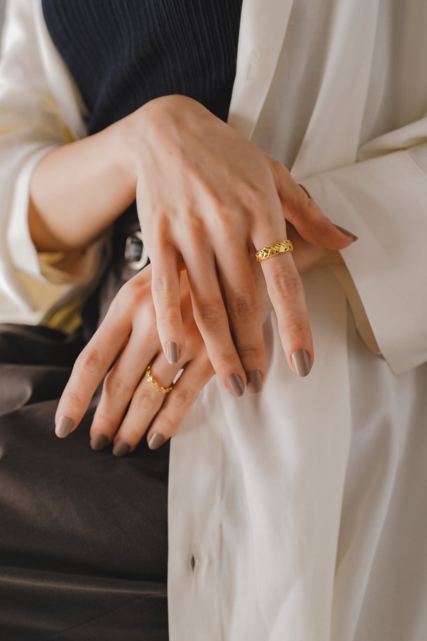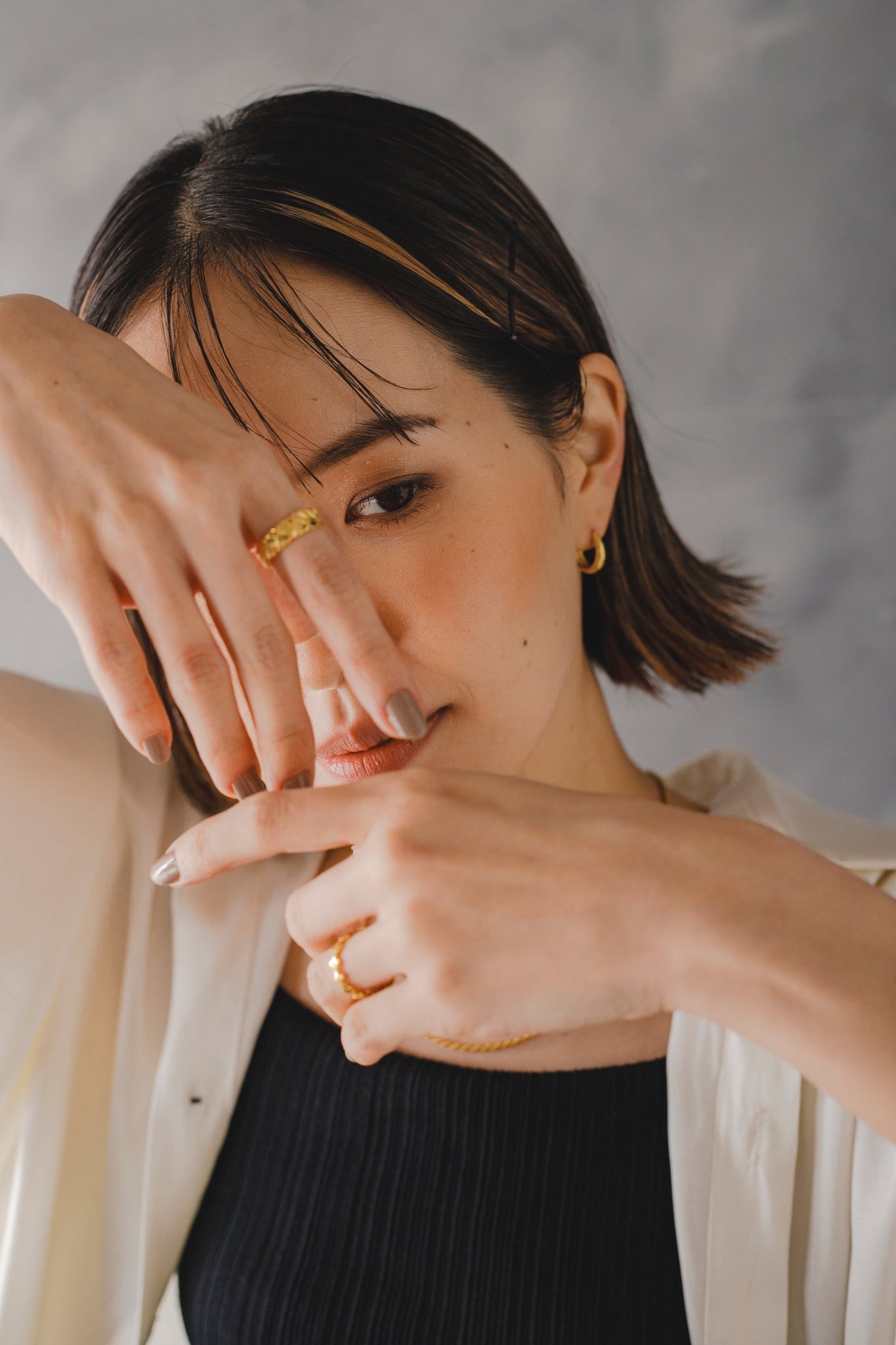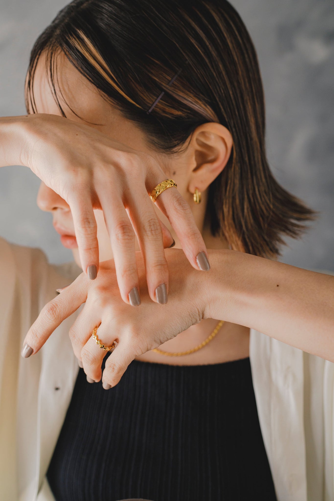 手指になじむ立体的なフォルムが手元に存在感を与えてくれ、親指につけても可愛いです◎